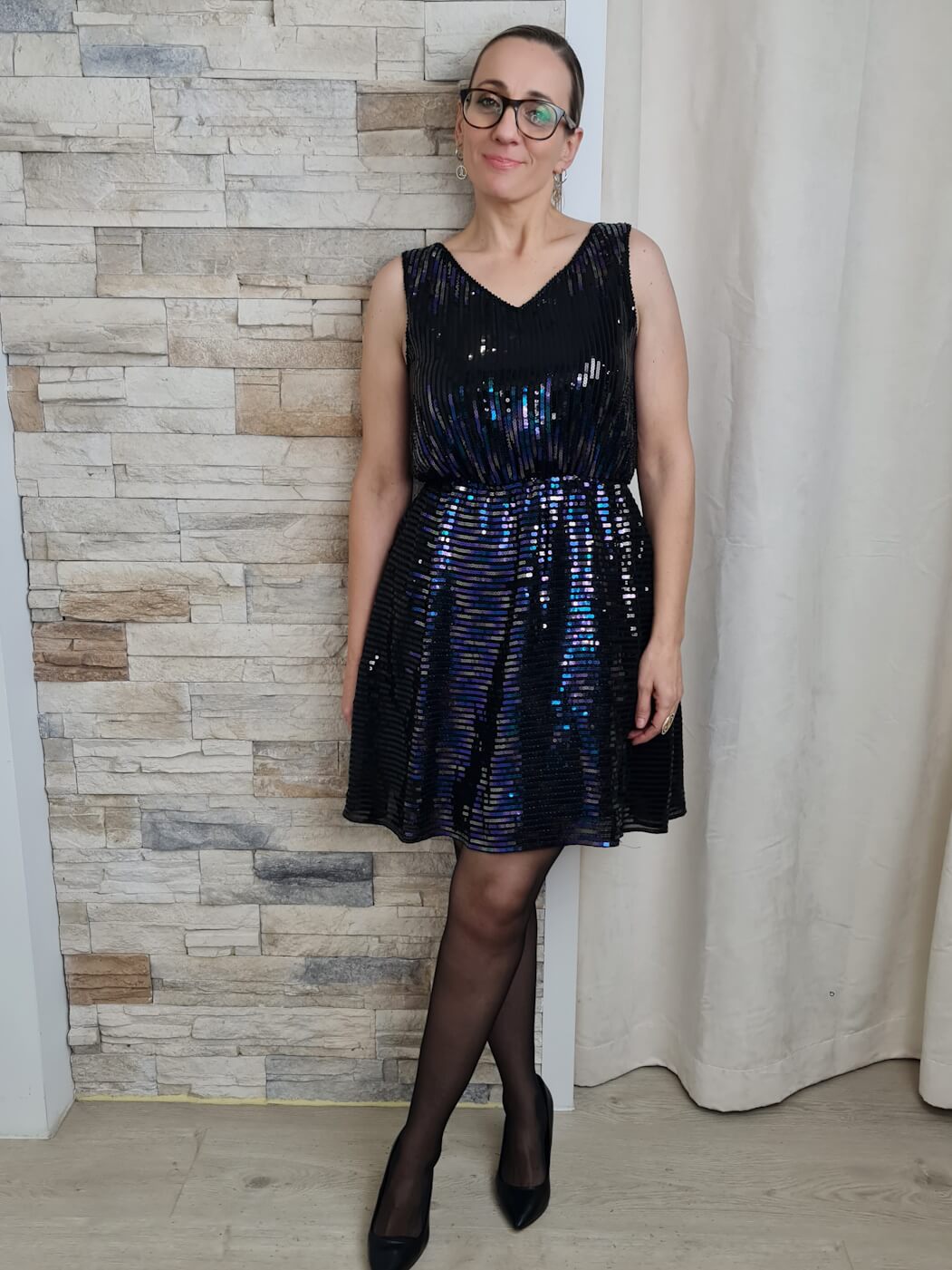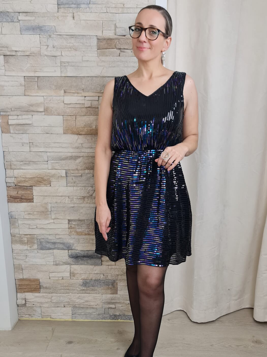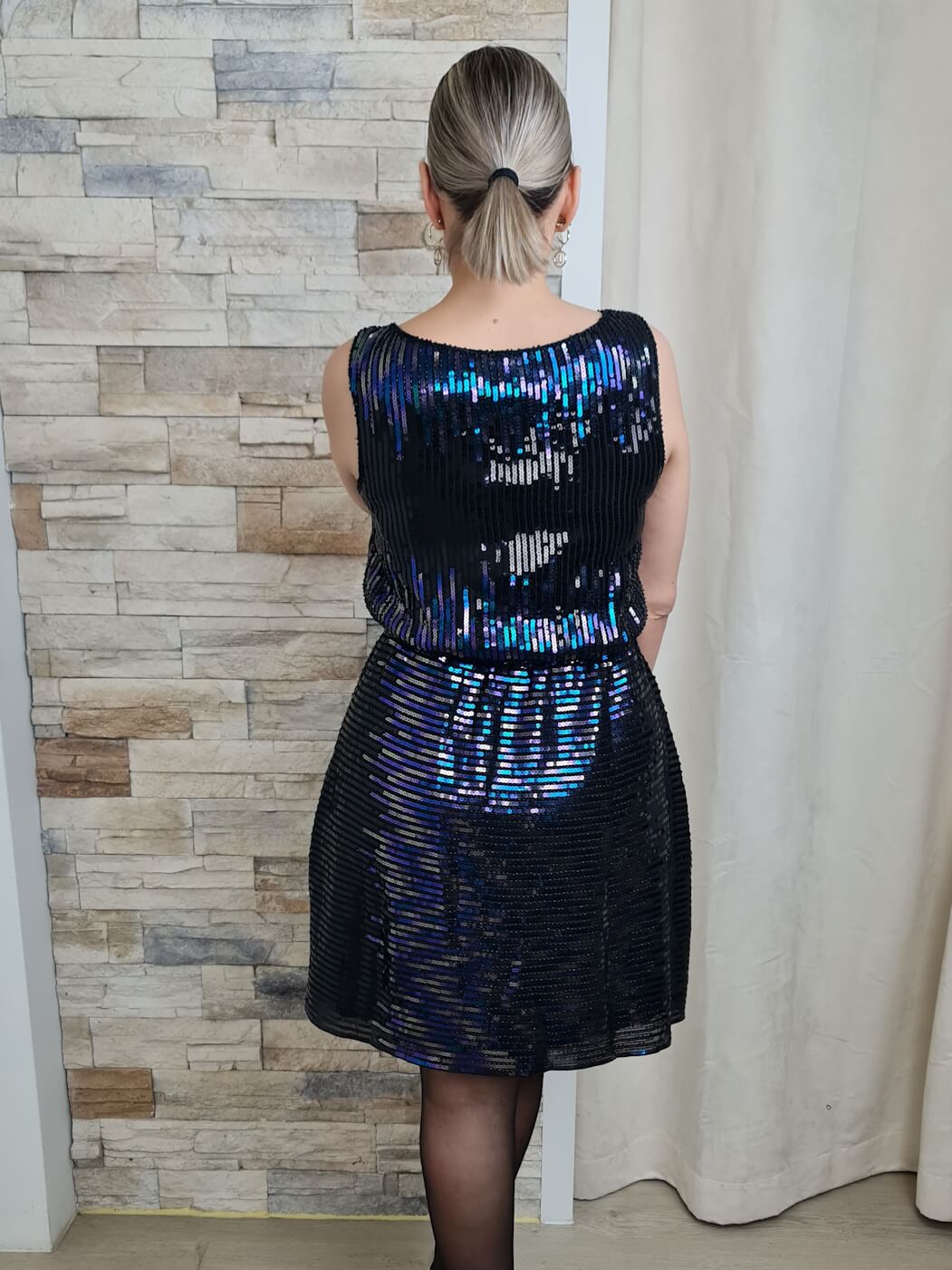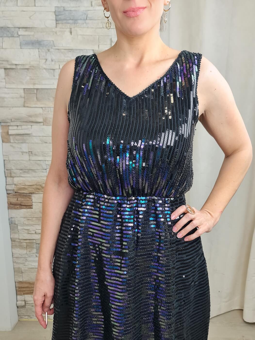 O vestido é uma peça moderna e festiva, ideal para diversas ocasiões. Apresenta um corte curto, terminando acima do joelho, com um decote em V. O vestido é coberto por lantejoulas pretas com reflexos em tons de azul e roxo, criando um efeito brilhante e sofisticado.