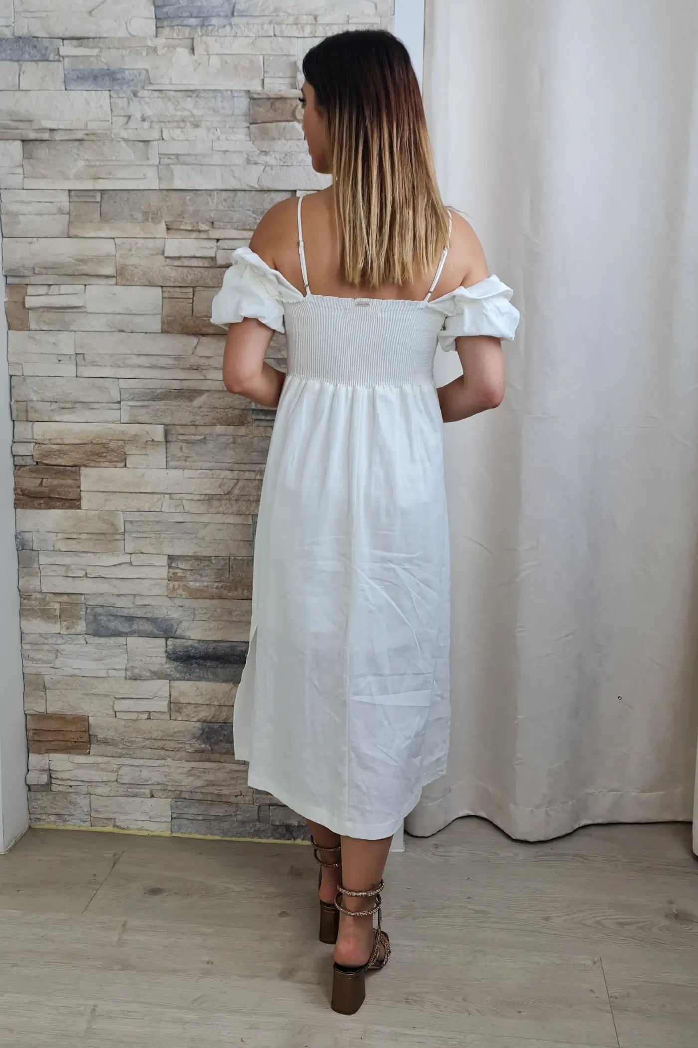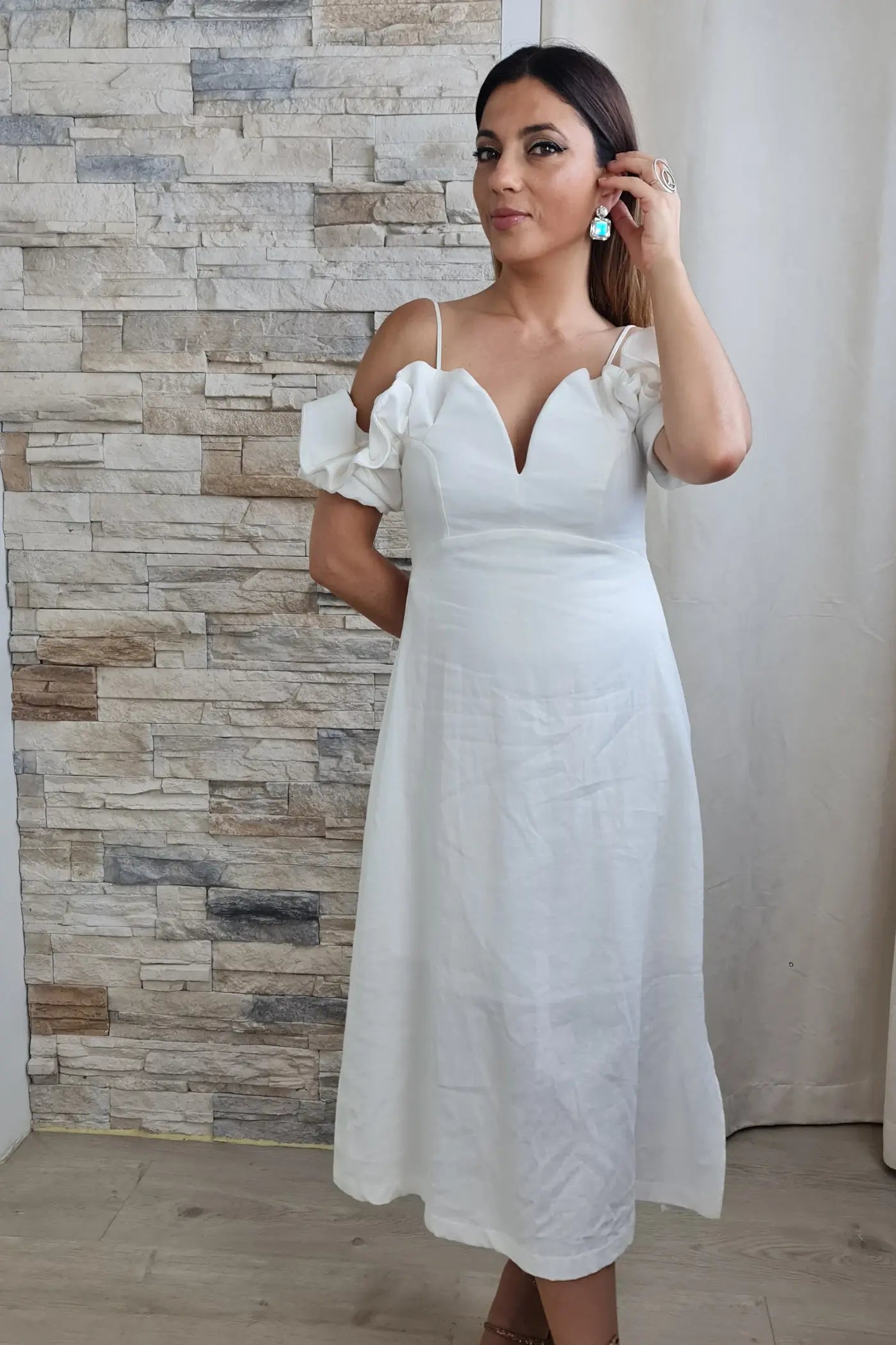 Ao vestir a "Feminilidade em Linho", sentirá uma sensação de frescura e um toque de originalidade. O tecido de linho e o caimento midi proporcionam bem-estar e a convidam a expressar a sua personalidade romântica.