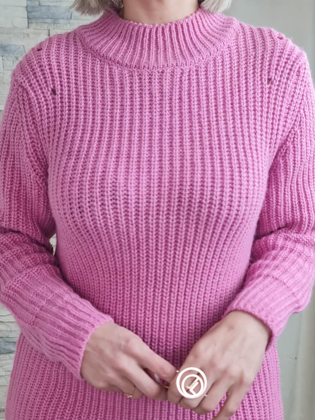 O vestido apresenta um design moderno e elegante, com um corte justo ao corpo e mangas compridas. A cor rosa vibrante da peça confere um ar alegre e feminino, ideal para diversas ocasiões. O detalhe que mais se destaca é o padrão canelado em relevo, que adiciona textura e interesse visual à peça. O decote redondo e a gola alta complementam o design, criando um look moderno e confortável.