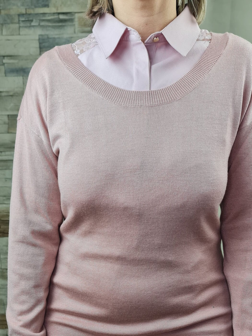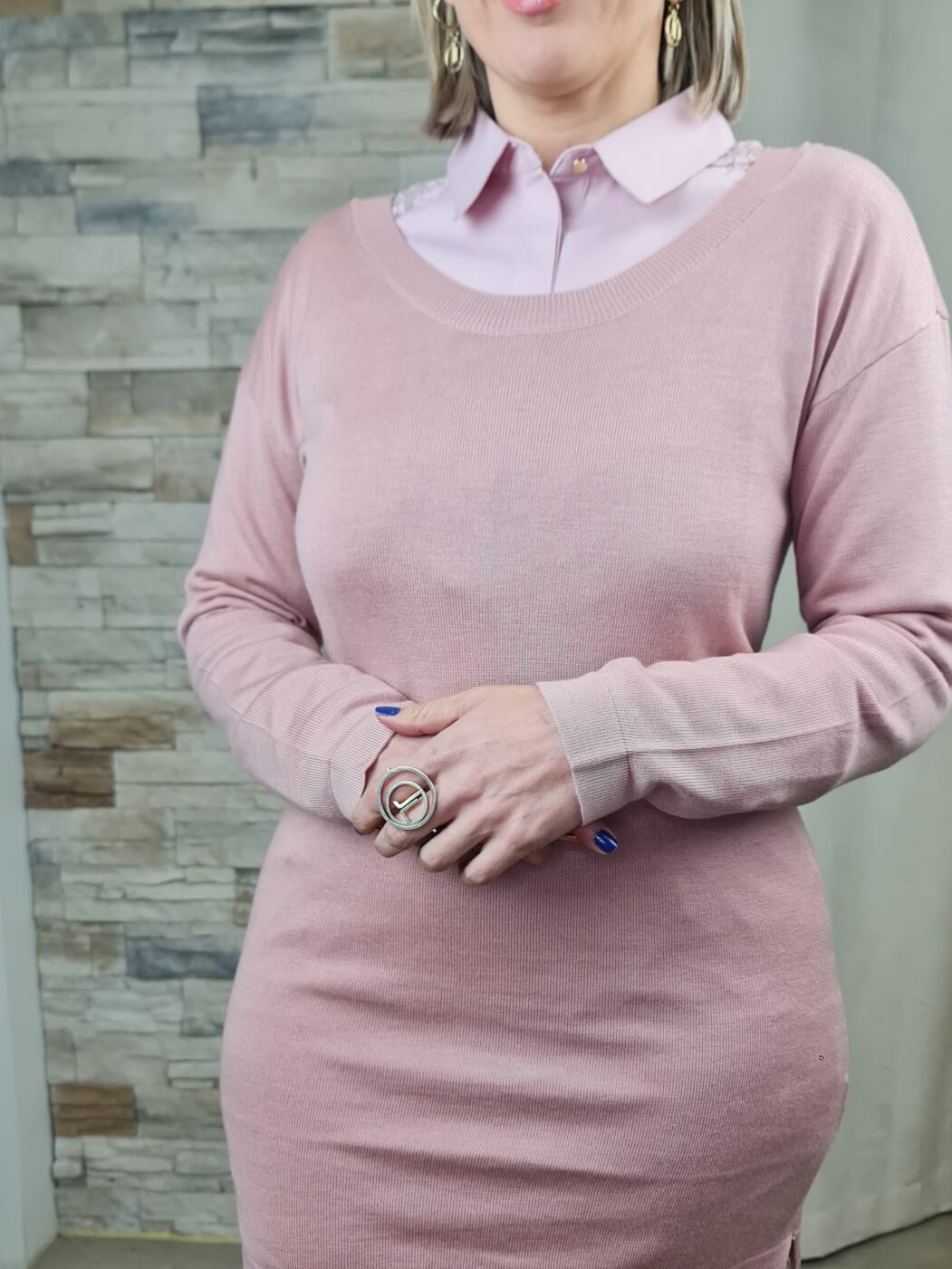 O vestido apresenta um design moderno e elegante, com um corte justo ao corpo e mangas compridas. A cor rosa claro da peça confere um ar sofisticado e feminino, ideal para diversas ocasiões. O detalhe que mais se destaca é a aplicação de renda na barra do vestido, que adiciona um toque romântico e delicado ao visual.