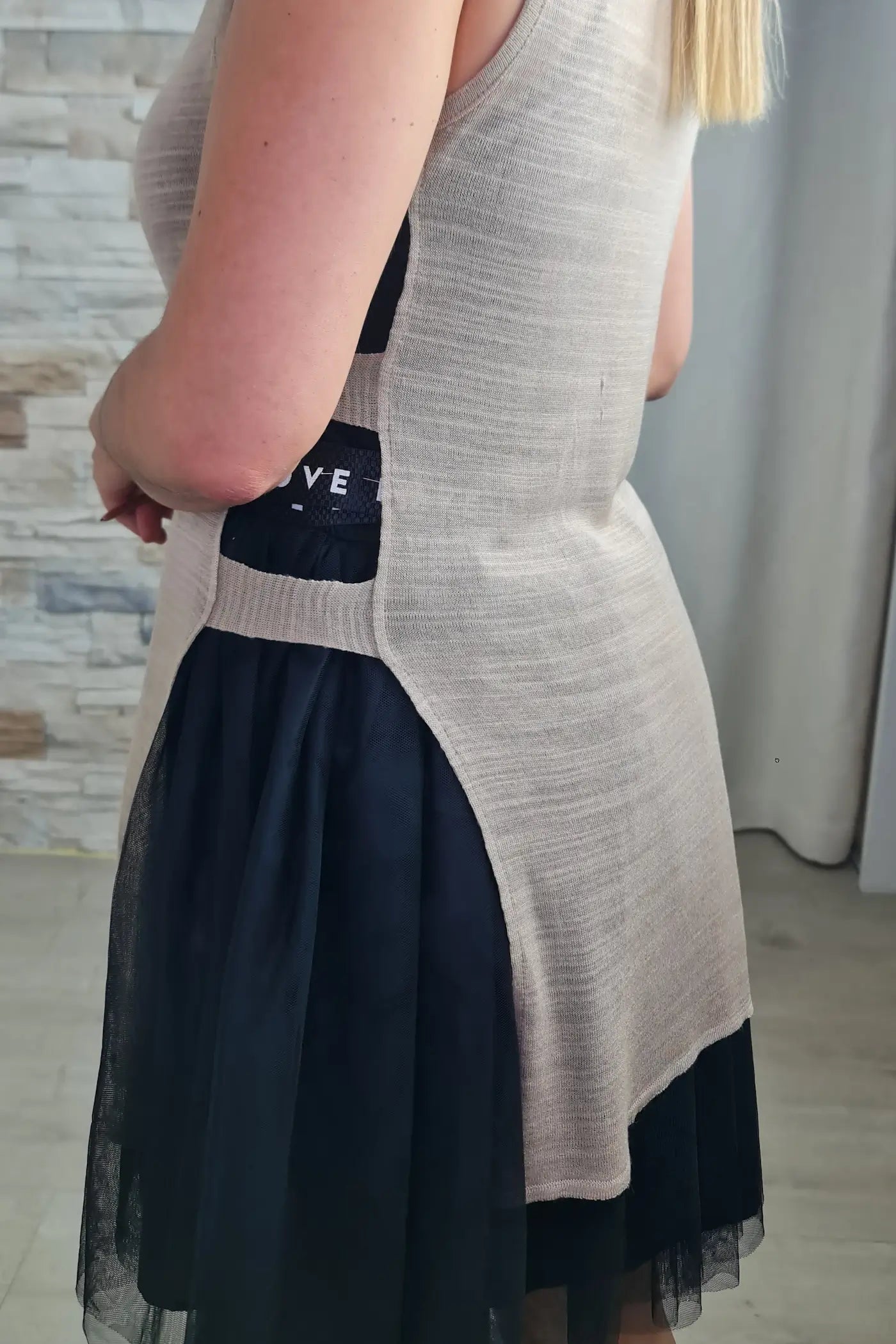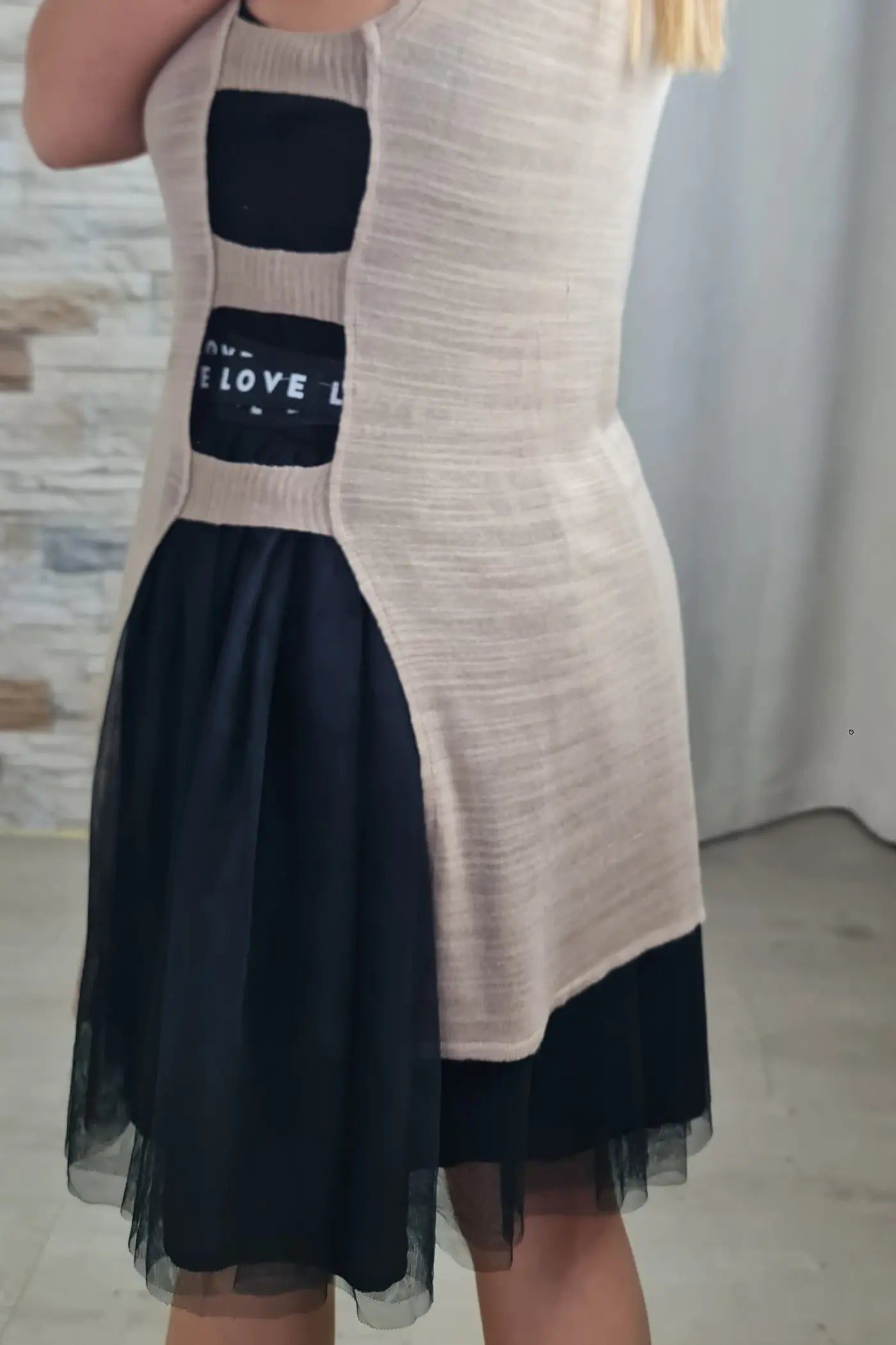 Ao vestir este vestido, sentirá a fluidez e a leveza da saia de tule, que se move graciosamente a cada passo, fazendo-a sentir-se elegante e etérea. O top básico de alça fina é a tela perfeita para a sua personalidade, permitindo que o foco esteja na sua essência única. O design da peça é um convite a abraçar o seu lado mais romântico e livre, sem precisar de seguir regras ou tendências. Para completar a beleza do look, o vestido apresenta uma fita com letras brancas, onde consta a palavra "LOVE".