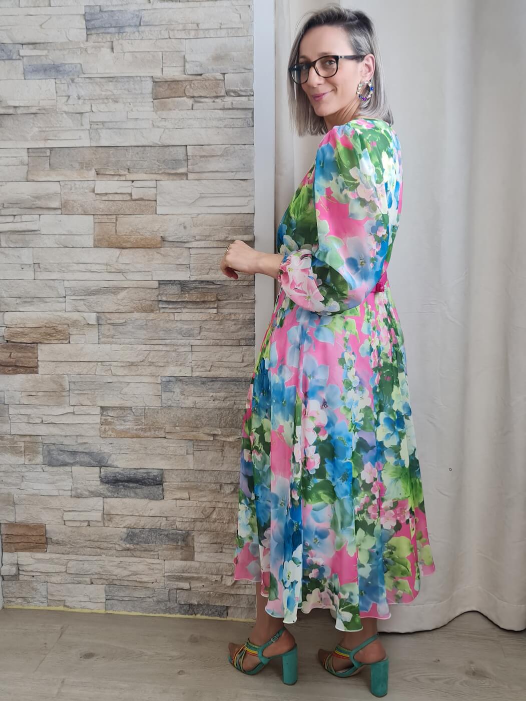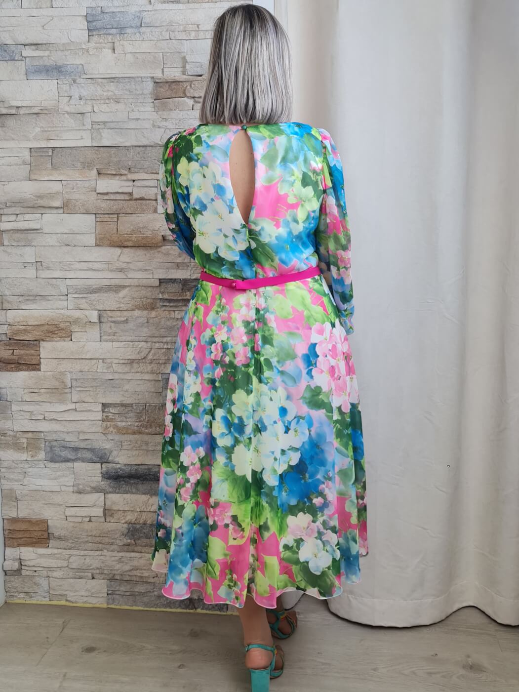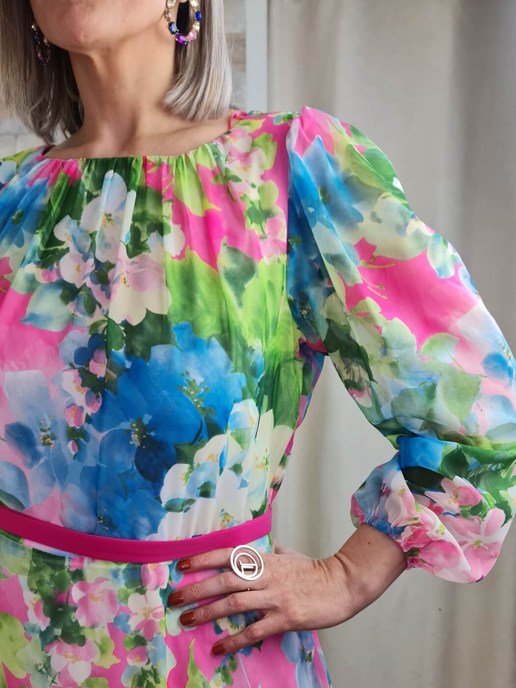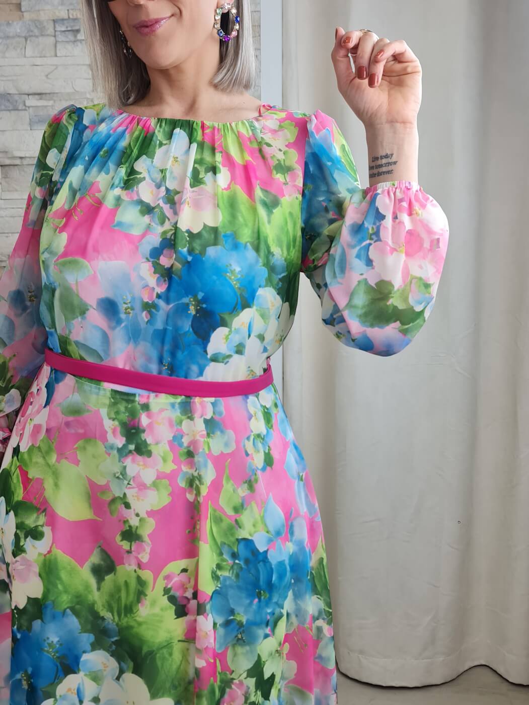 Este vestido midi exala uma aura de frescura e vivacidade, perfeito para os dias de sol e eventos ao ar livre. O padrão floral em tons de azul, rosa e verde cria um efeito visual alegre e vibrante, evocando a beleza de um jardim em plena floração.