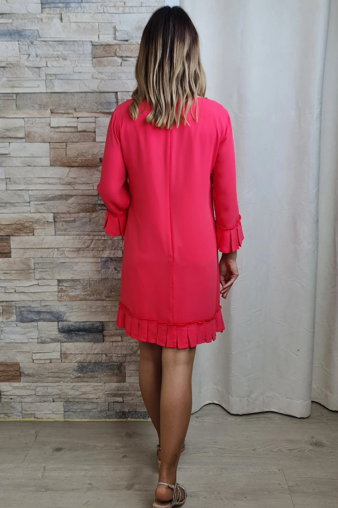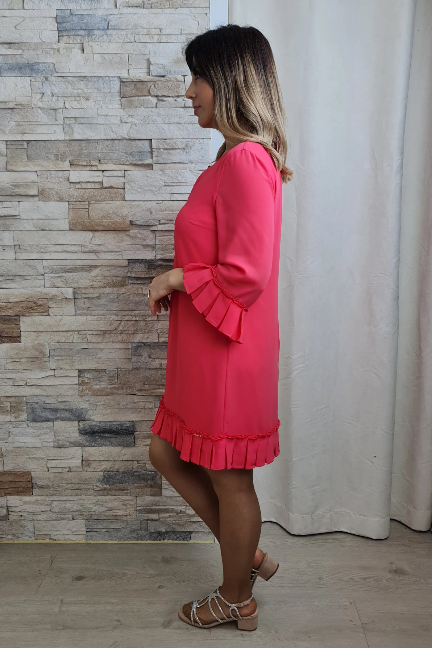 O vestido é uma peça moderna e elegante, ideal para diversas ocasiões. Apresenta um corte reto e comprimento acima do joelho. A cor rosa vibrante confere um toque alegre e feminino ao look.