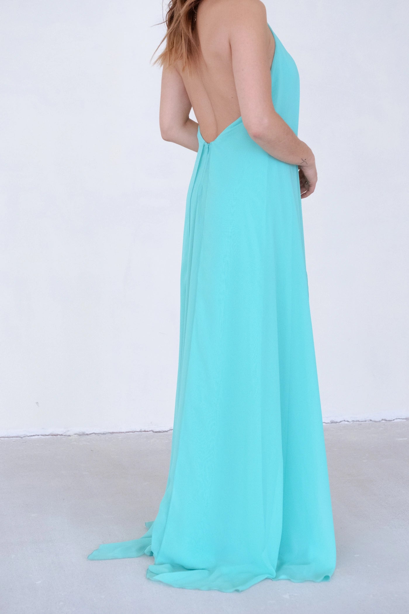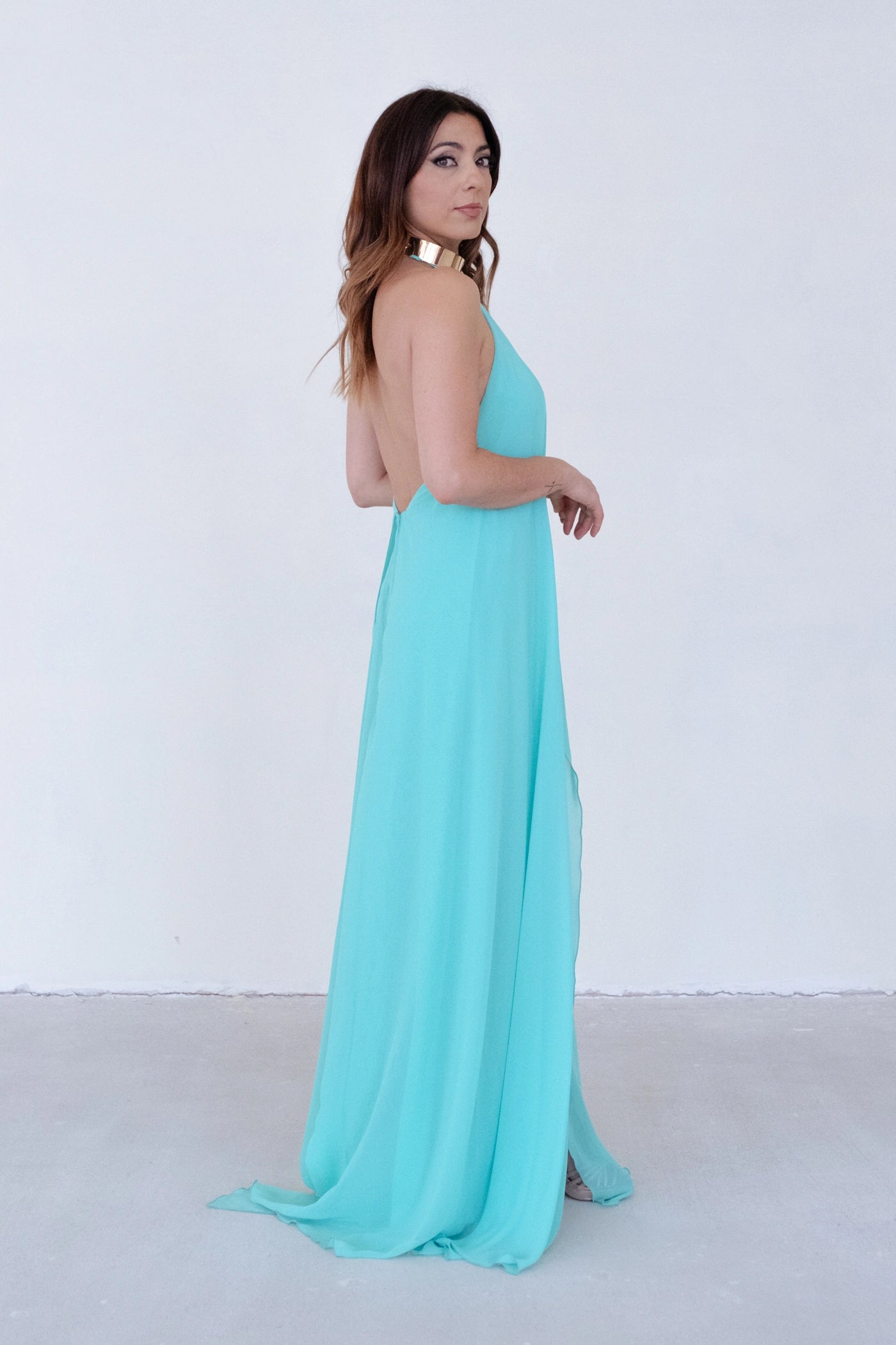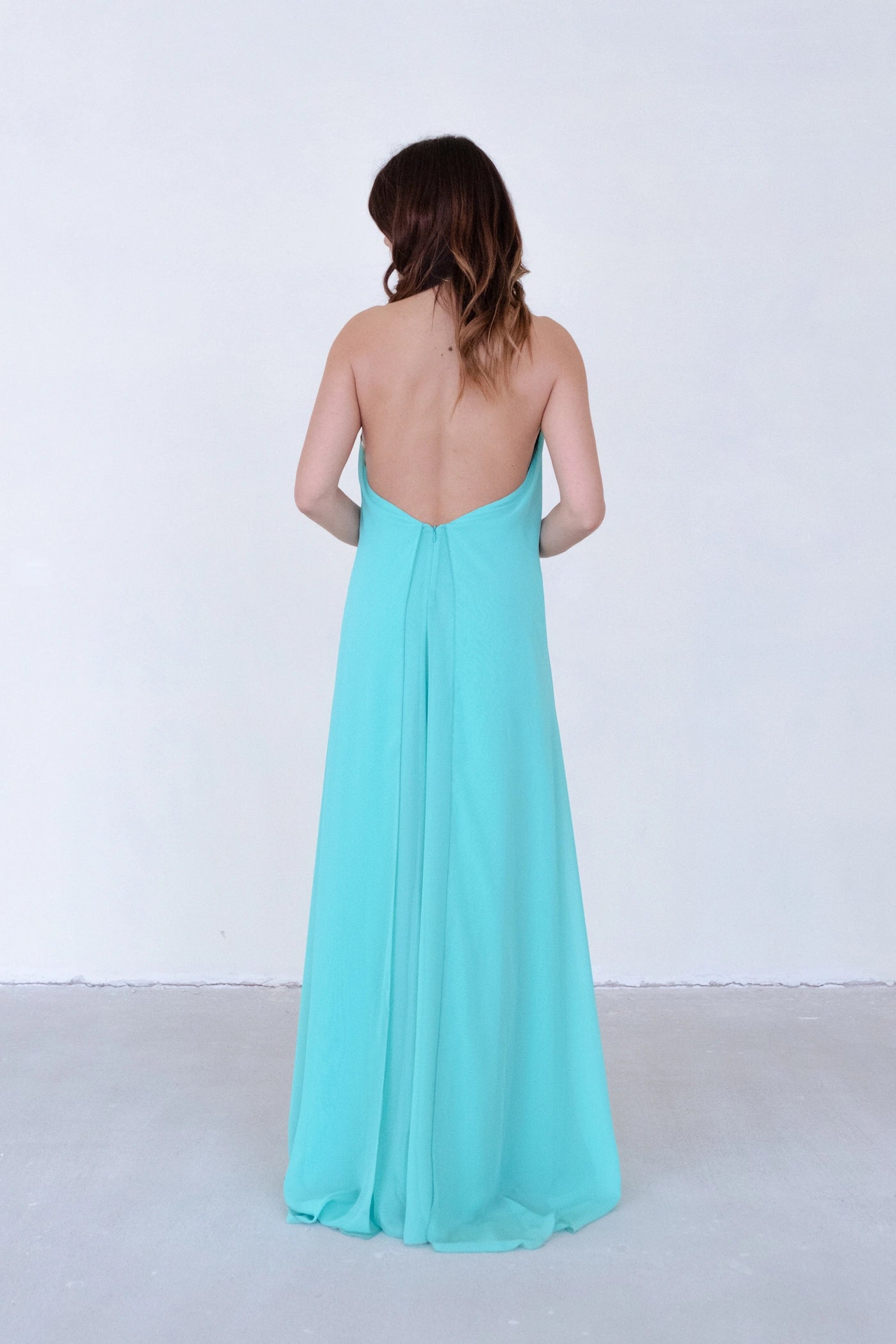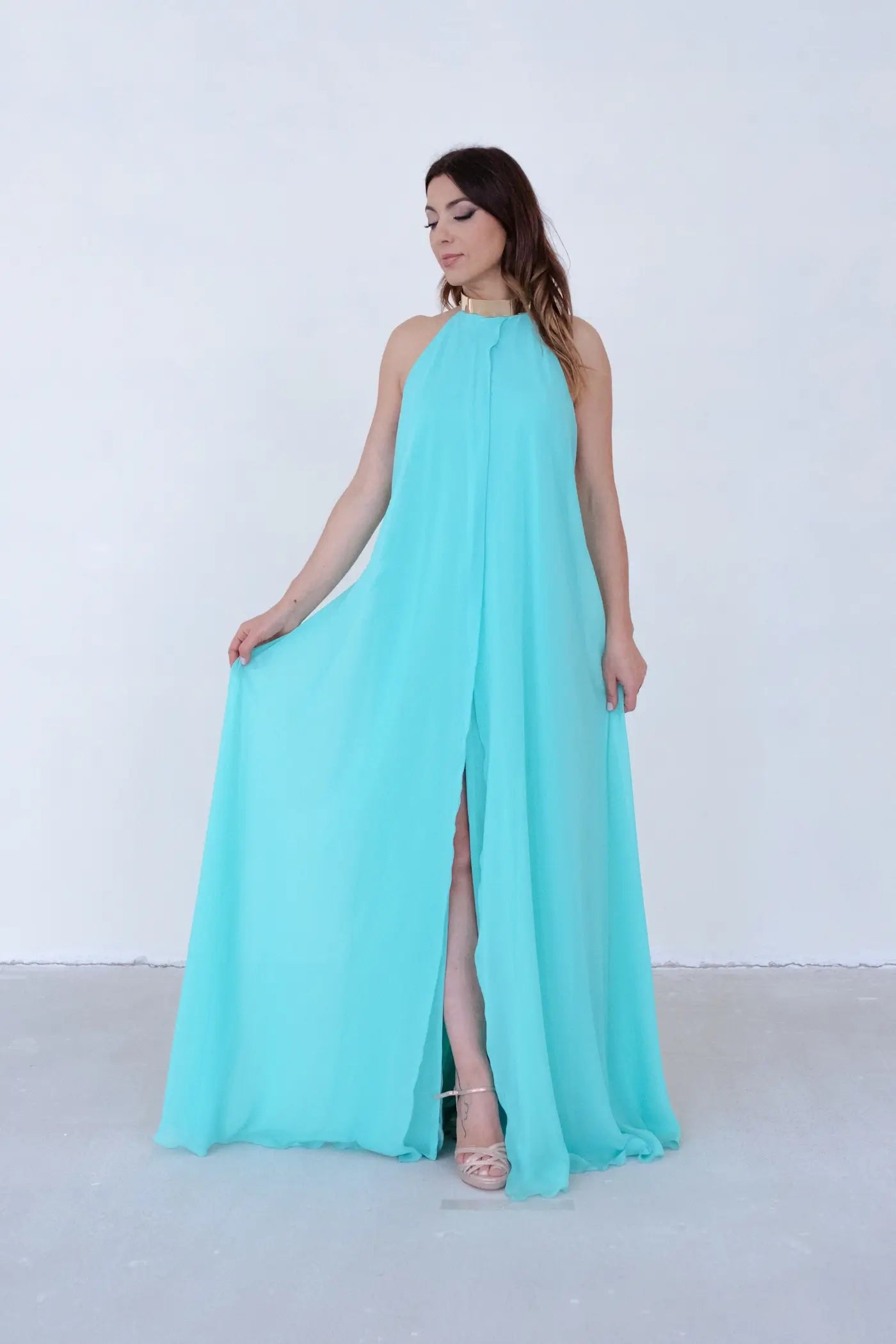 Imagina-te a entrar numa sala e sentir todos os olhares sobre ti. O tecido fluído acompanha cada movimento, a gargantilha emoldura o teu rosto com elegância, e o coral vibrante reflete a tua personalidade radiante. Este não é apenas um vestido, é uma declaração de confiança.