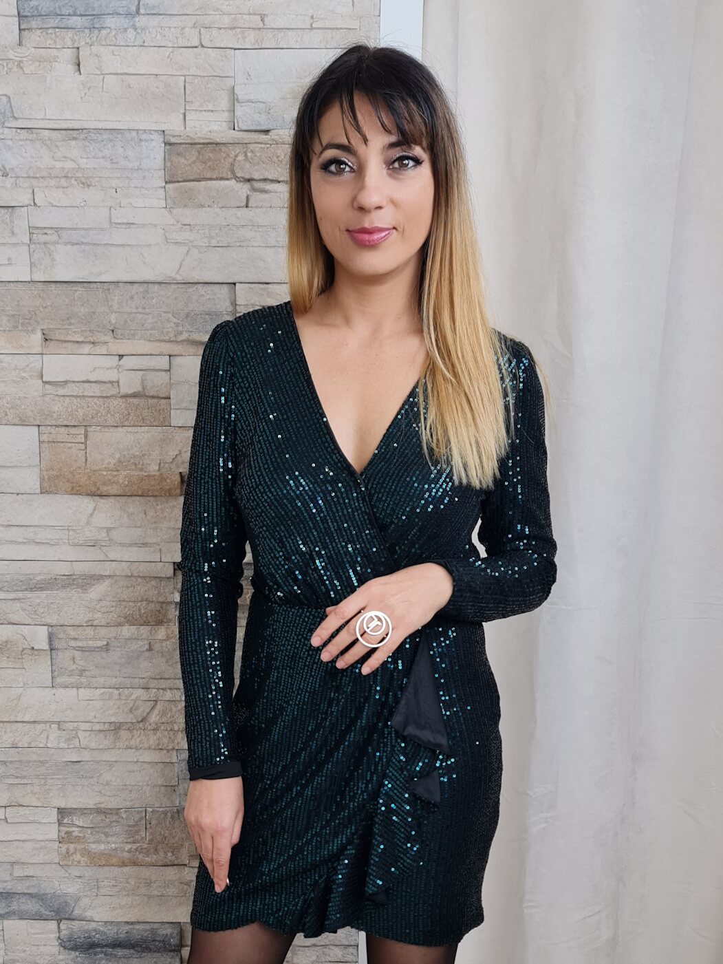 O vestido é uma peça moderna e festiva, ideal para diversas ocasiões. Apresenta um corte curto, terminando acima do joelho, e um decote em V transpassado. O vestido é todo coberto por lantejoulas em tons de verde esmeralda e preto, criando um efeito brilhante e sofisticado.
