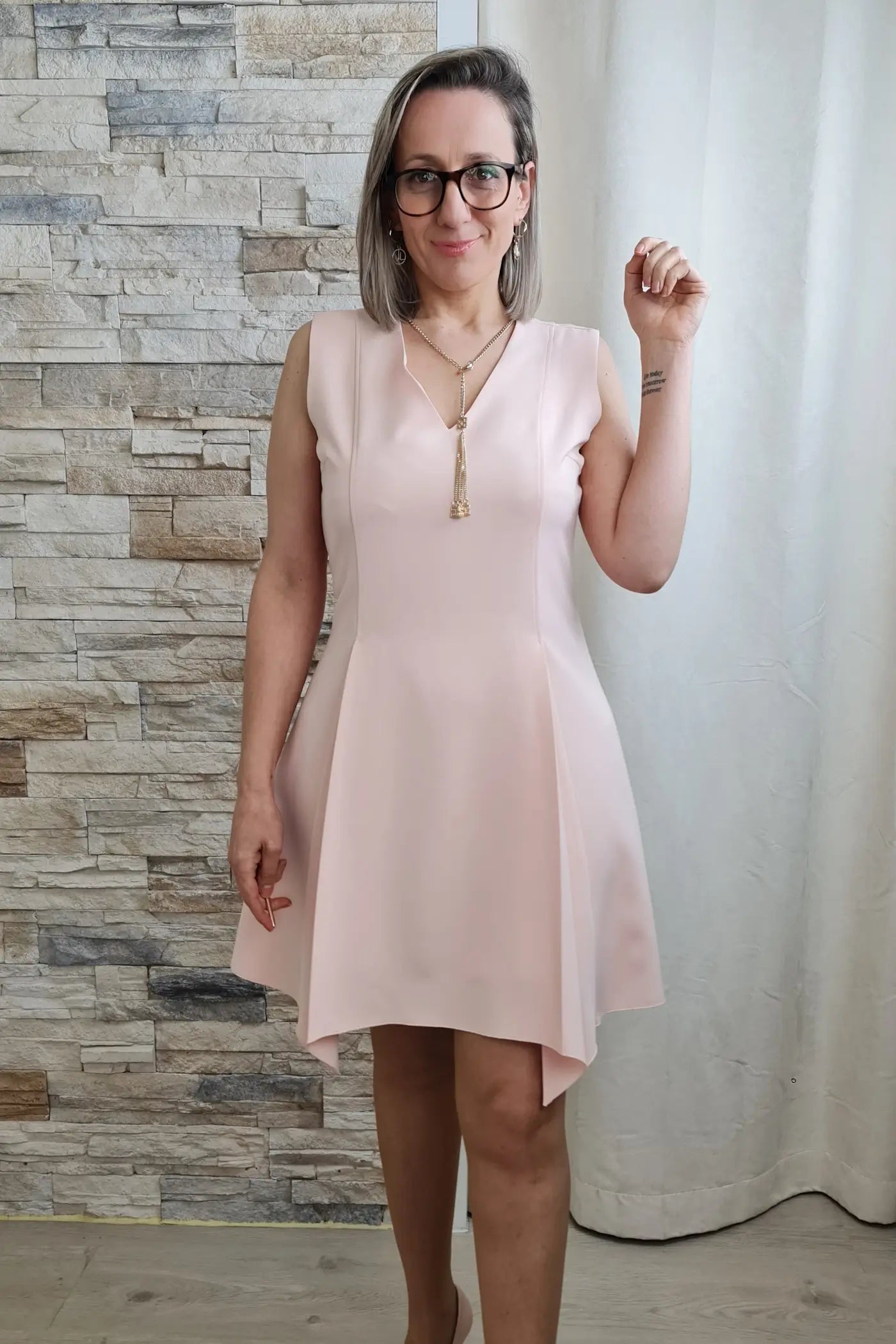 O vestido é uma peça moderna e elegante, ideal para eventos especiais. O design apresenta um corte curto com decote em V e mangas curtas. O tecido rosa claro confere um toque romântico e delicado ao look. Os detalhes das correntes douradas nos ombros adicionam um toque de sofisticação à peça. A silhueta ajustada define a figura feminina.