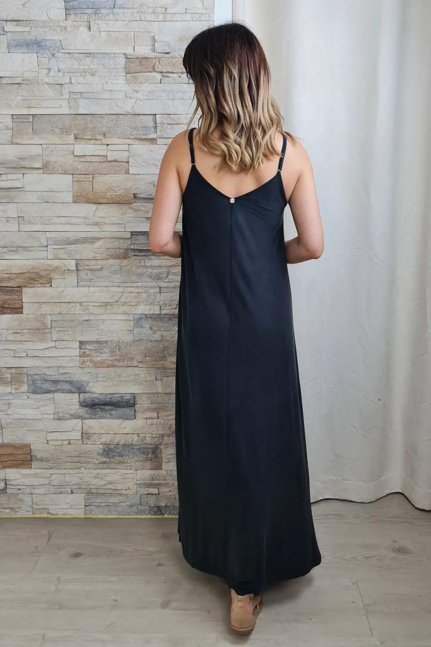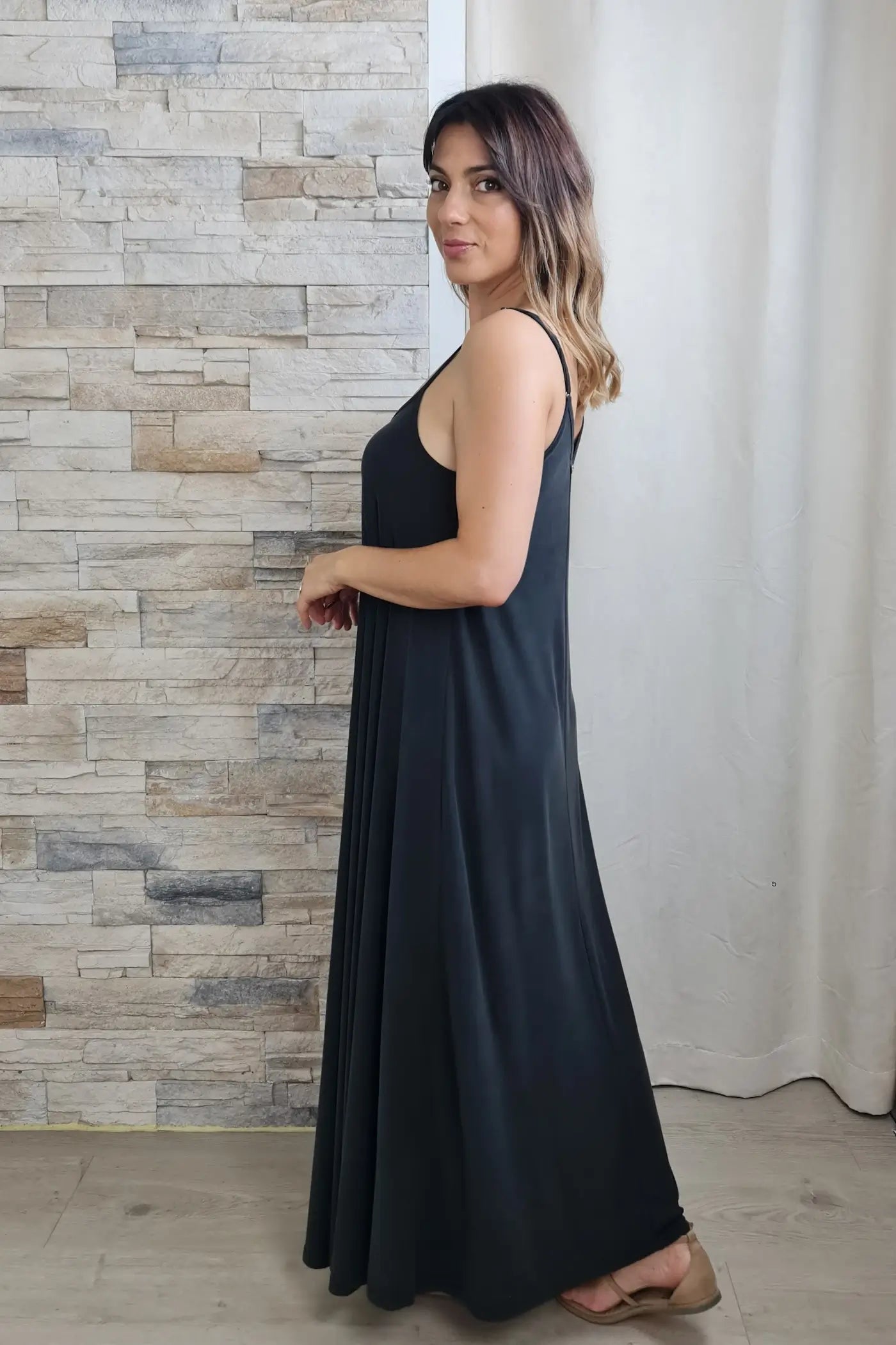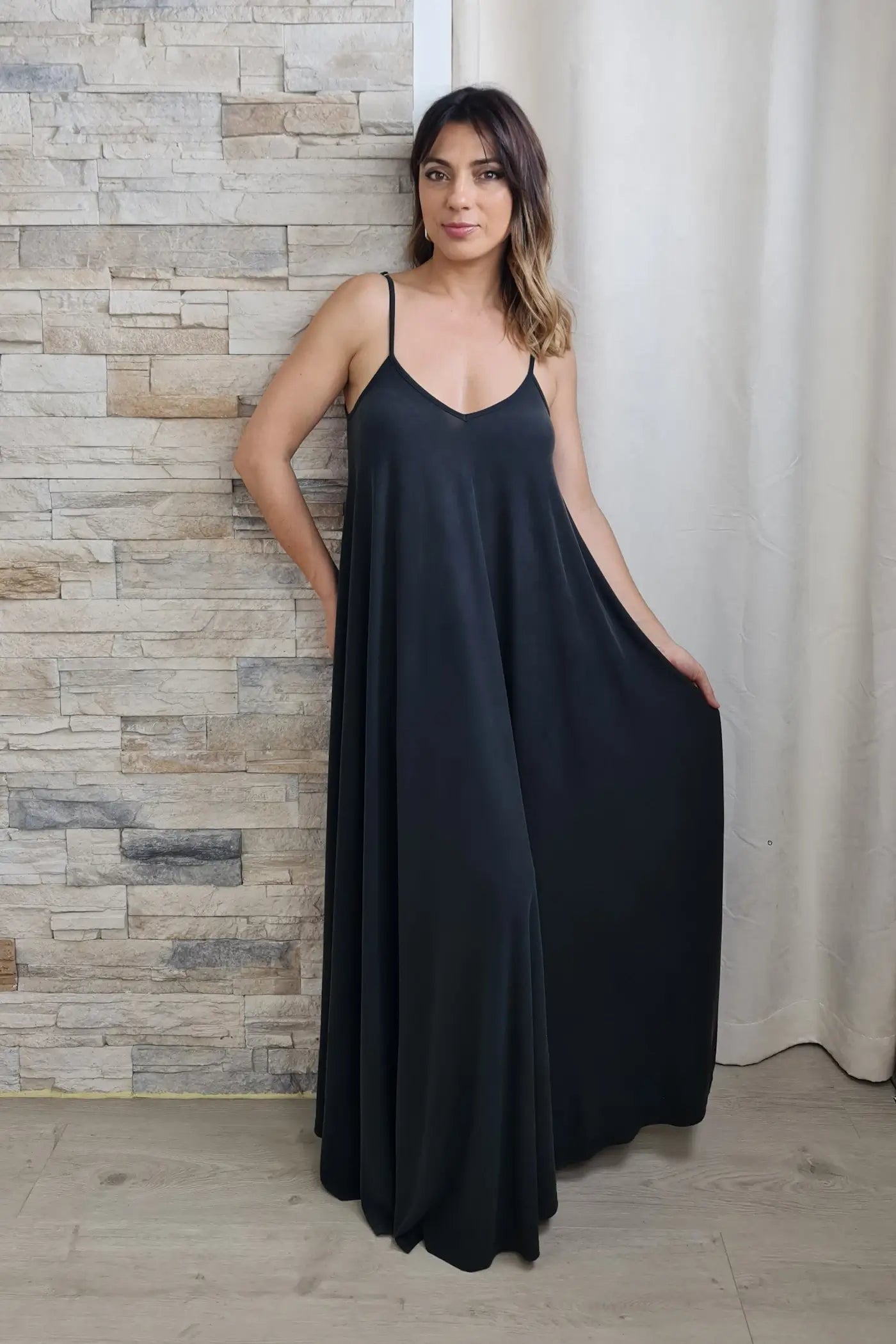 O design é a prova de que a simplicidade é a forma mais elevada de sofisticação. Com corte amplo e fluído, decote em V e alças finas, oferece um movimento elegante e uma silhueta que celebra a liberdade. O tom preto intemporal o torna incrivelmente versátil.