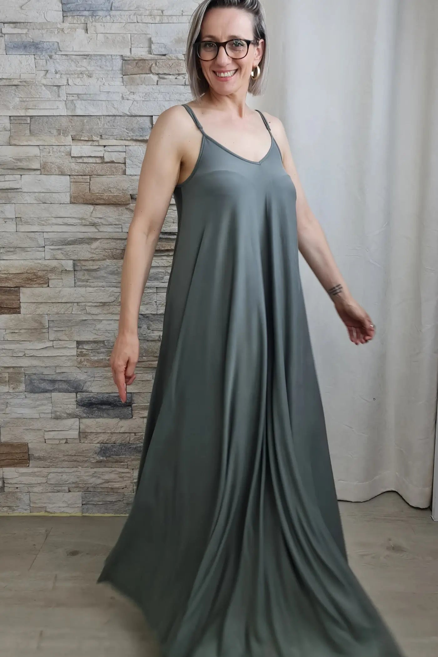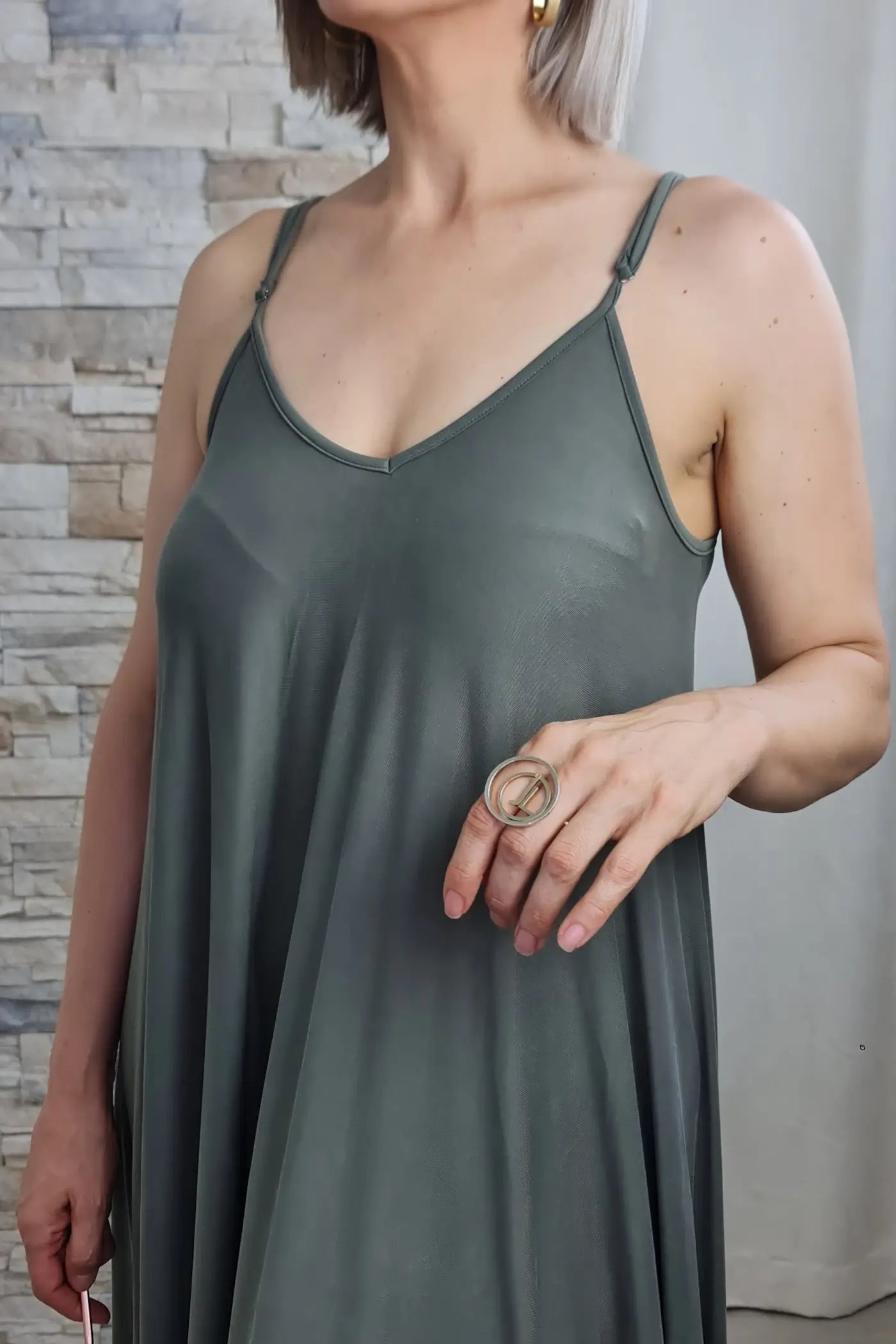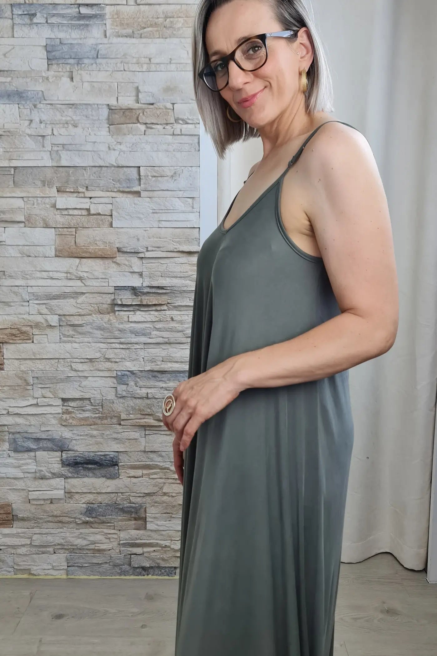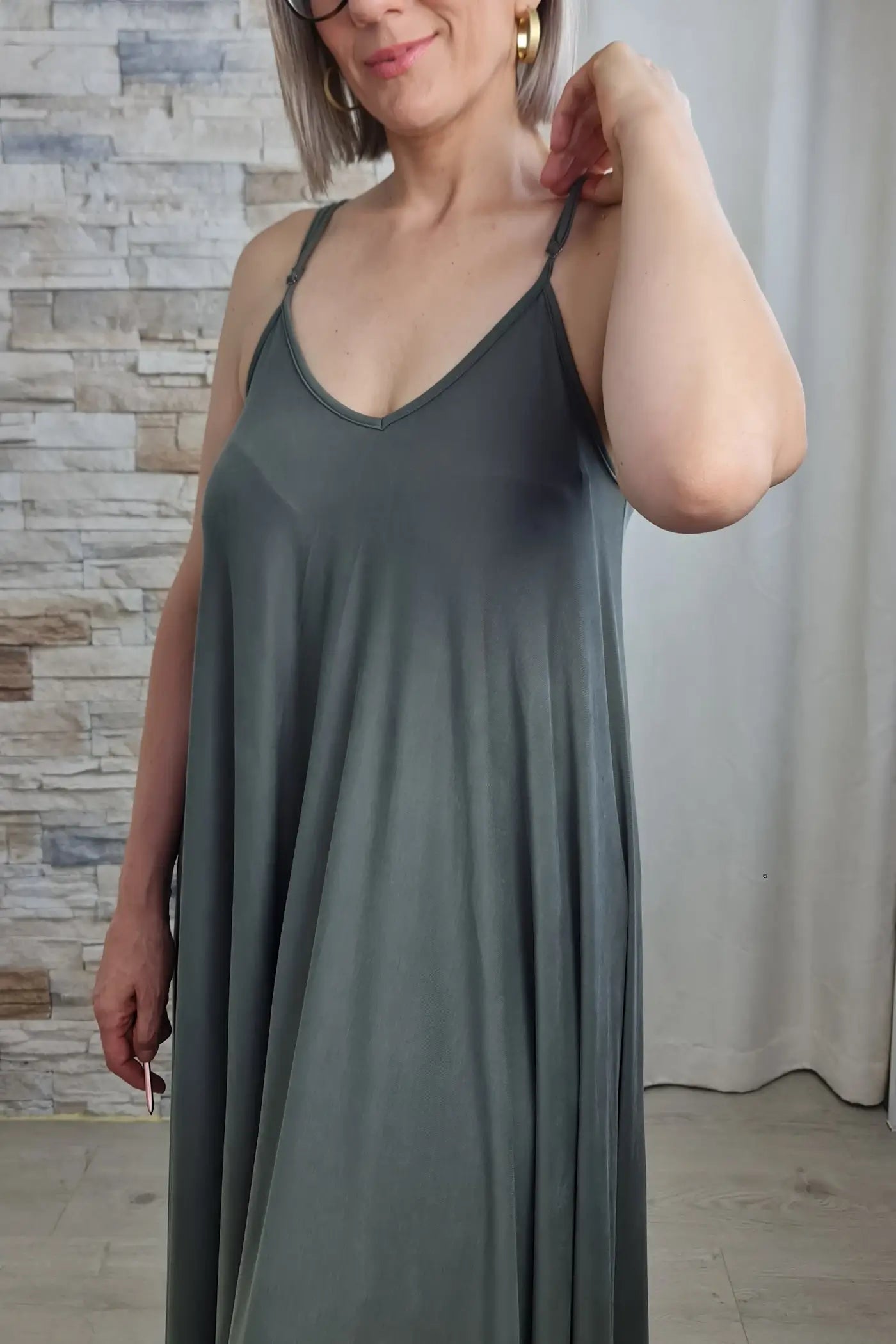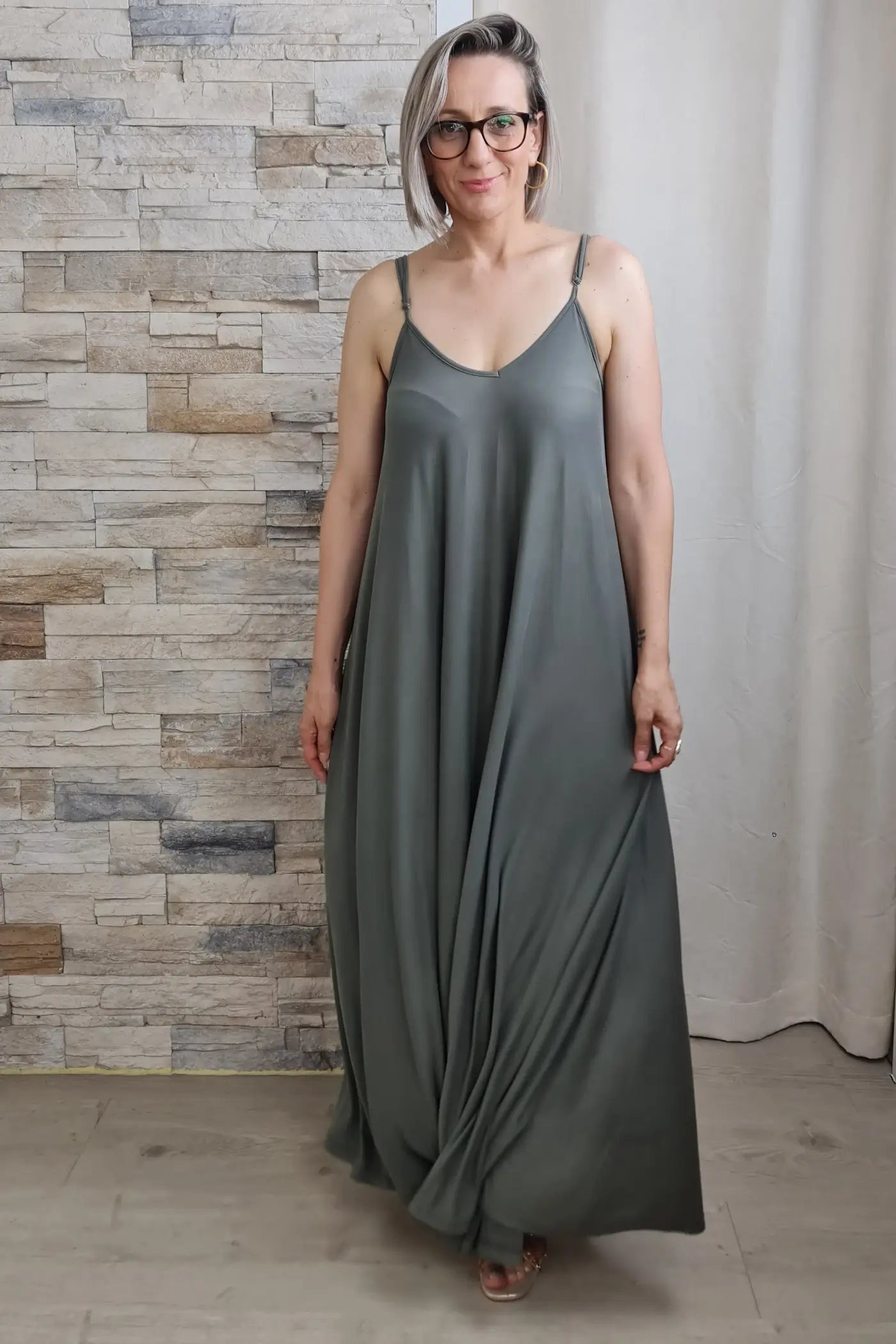 O design é a união perfeita de simplicidade e estilo. Com um corte amplo e fluído, decote em V e alças finas, oferece movimento e uma silhueta que celebra a autenticidade. O seu tom verde, suave e versátil, transmite calma e elegância.