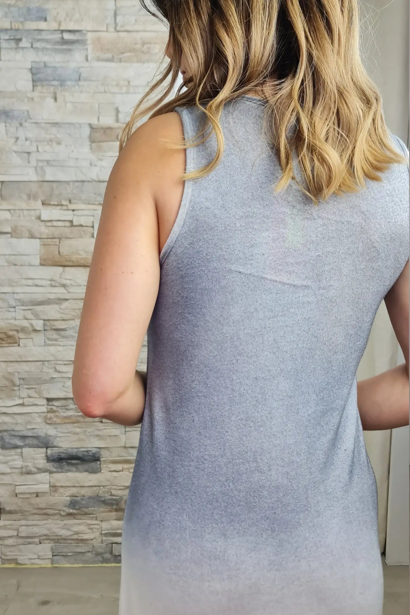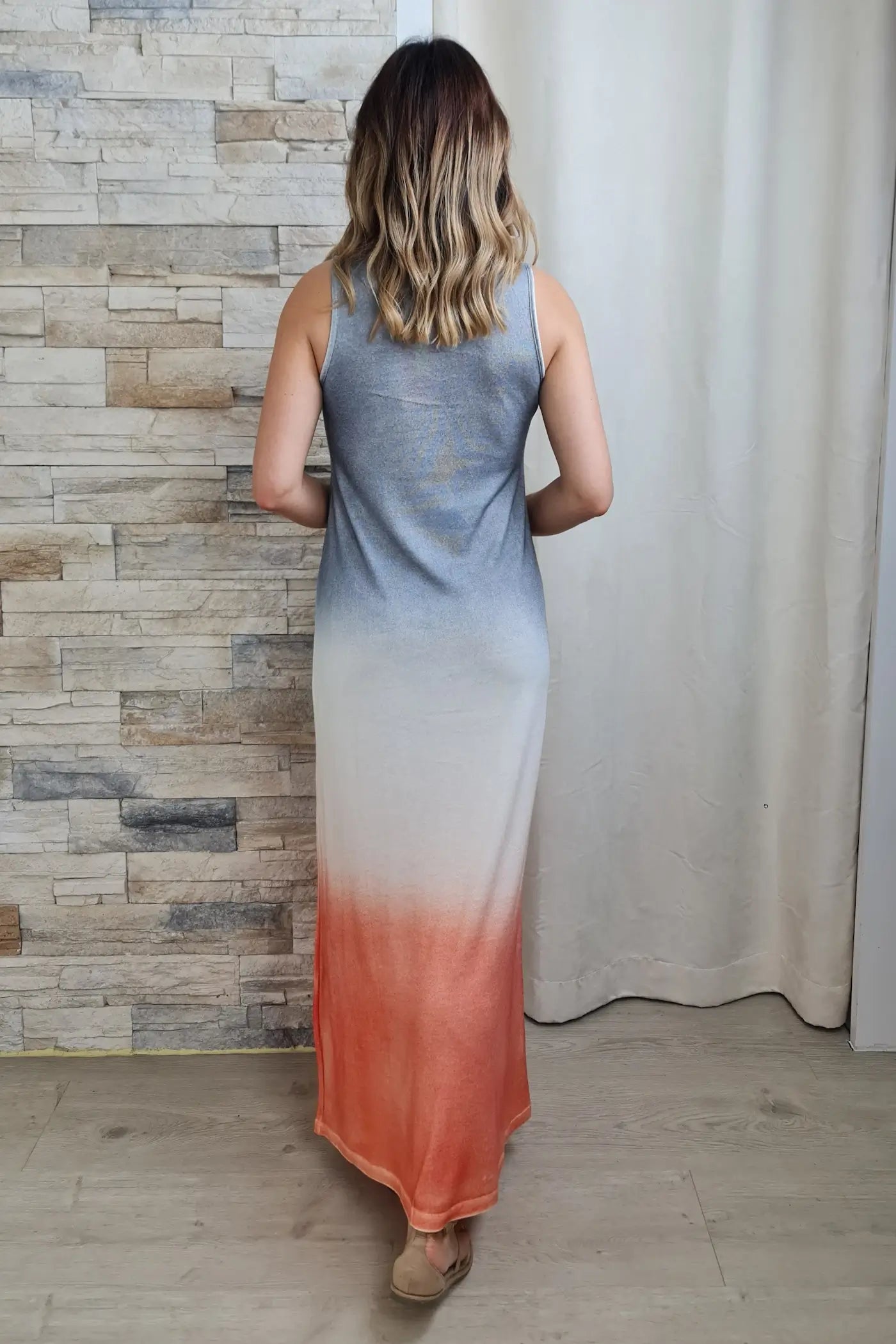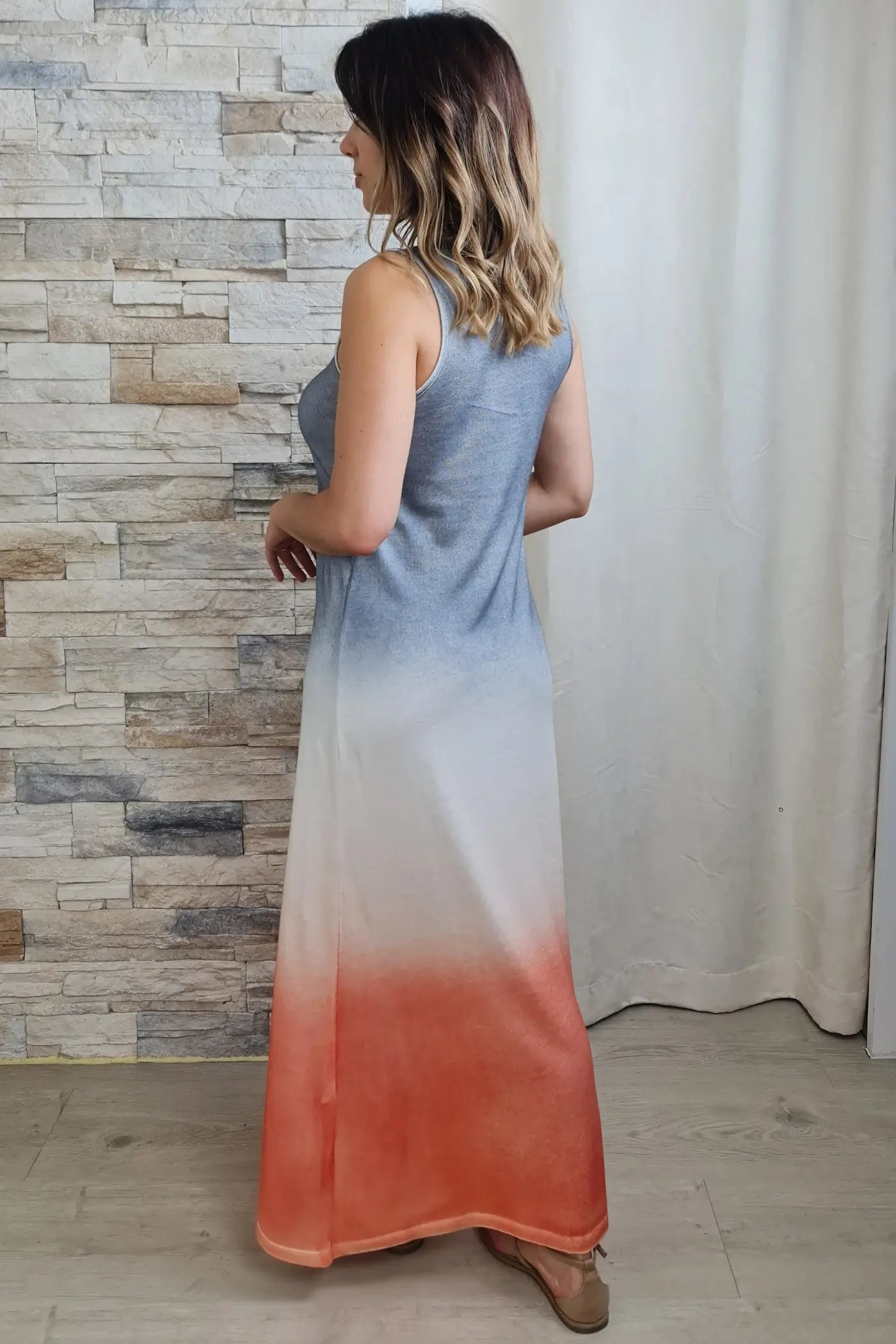 O design do "Serenidade Transforma" é uma ode à beleza da transição e da harmonia. Apresenta um corte longo e fluido, com um decote redondo clássico e alças largas, que proporcionam conforto e um ajuste perfeito. O seu maior destaque é o efeito ombré tricolor, que transita suavemente do cinza na parte superior, para um branco puro no meio, culminando num vibrante tom de coral na barra. Esta fusão de cores cria uma estética visualmente deslumbrante e simboliza a capacidade de transformação. Confeccionado em malha leve e respirável, este vestido garante um caimento impecável e adapta-se maravilhosamente ao corpo, oferecendo liberdade de movimento e um toque de modernidade discreta.