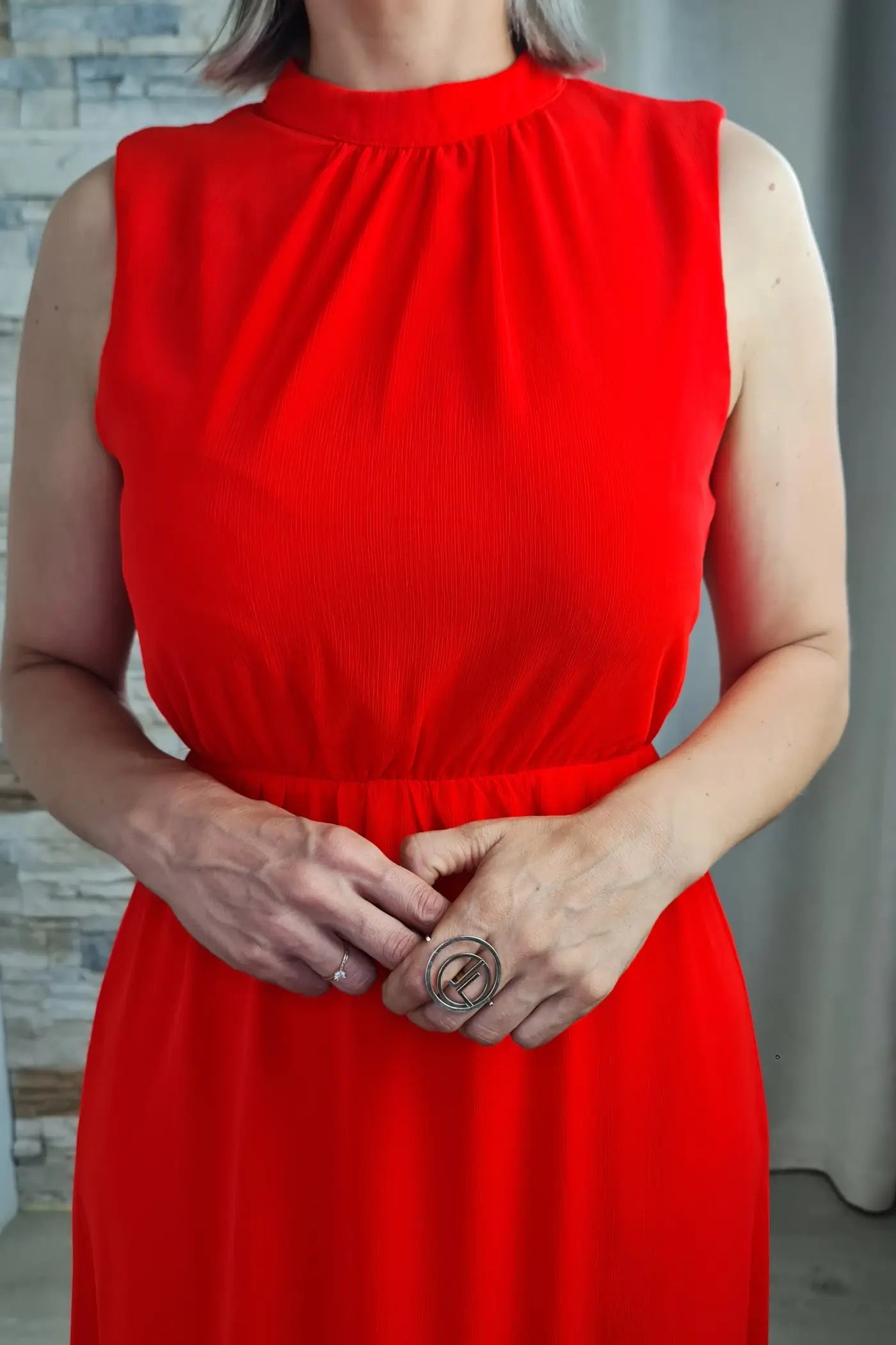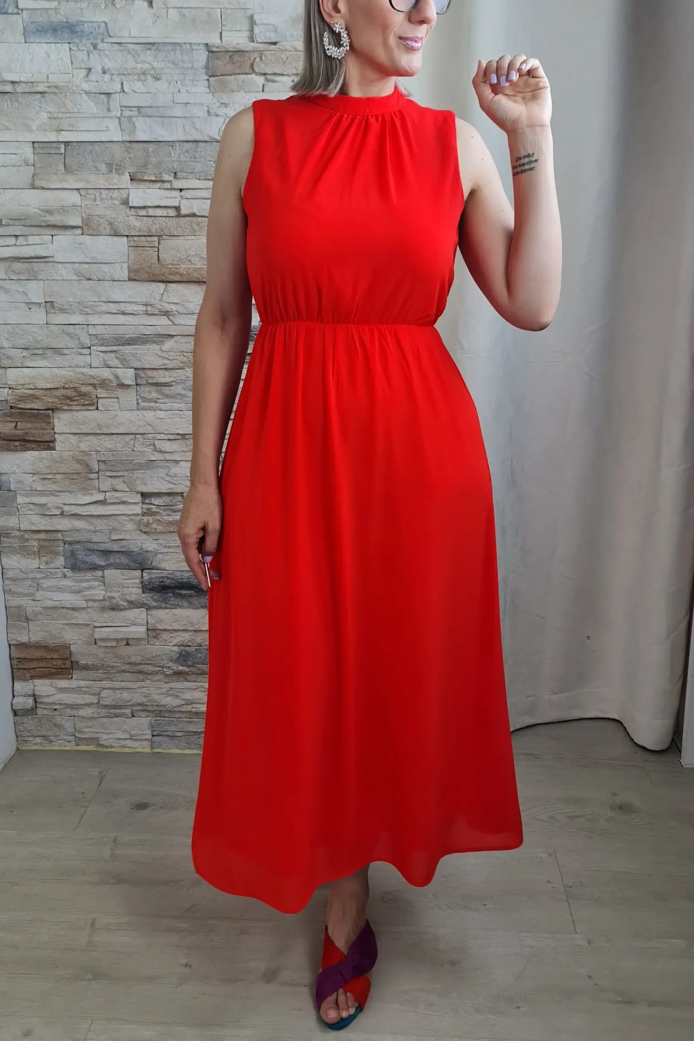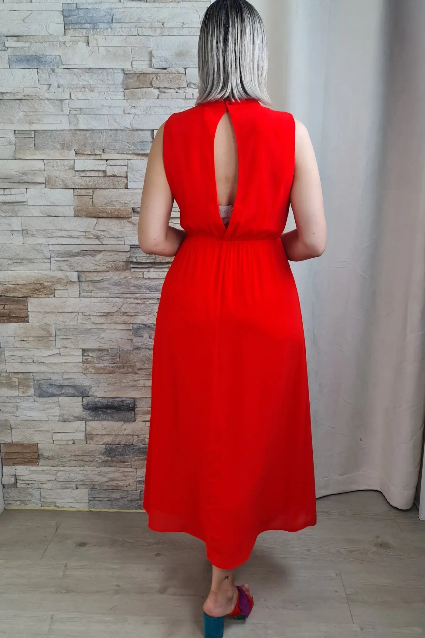 O design é prático e elegante. Em tom alaranjado vibrante, destaca-se pela gola alta com drapeado e pelo corte sem mangas, que confere um ar feminino e delicado. A cintura é elástica, realçando a silhueta, e a saia fluida e comprida com uma bainha assimétrica confere um ar descontraído e sofisticado.