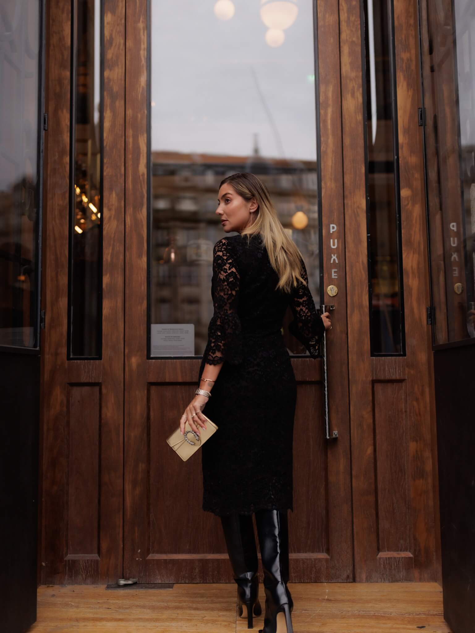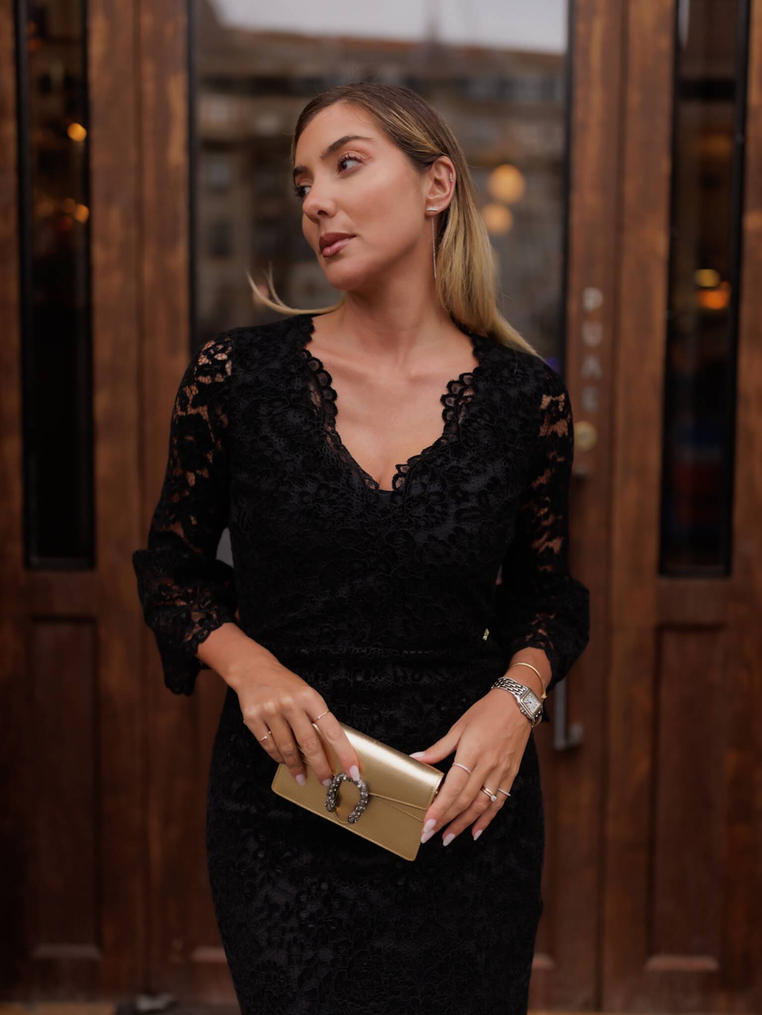 O design é clássico e sensual. Com decote em V e mangas compridas, destaca-se pela cor preta profunda e o detalhe da renda floral, que adiciona um toque de feminilidade e mistério. O comprimento midi confere um ar sofisticado e versátil.