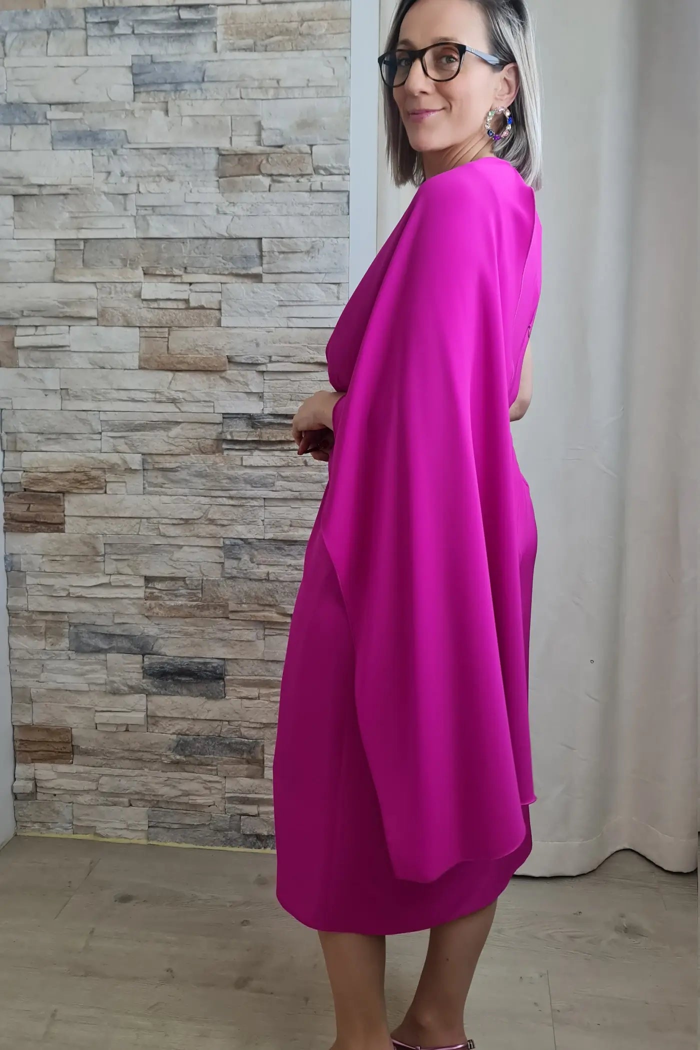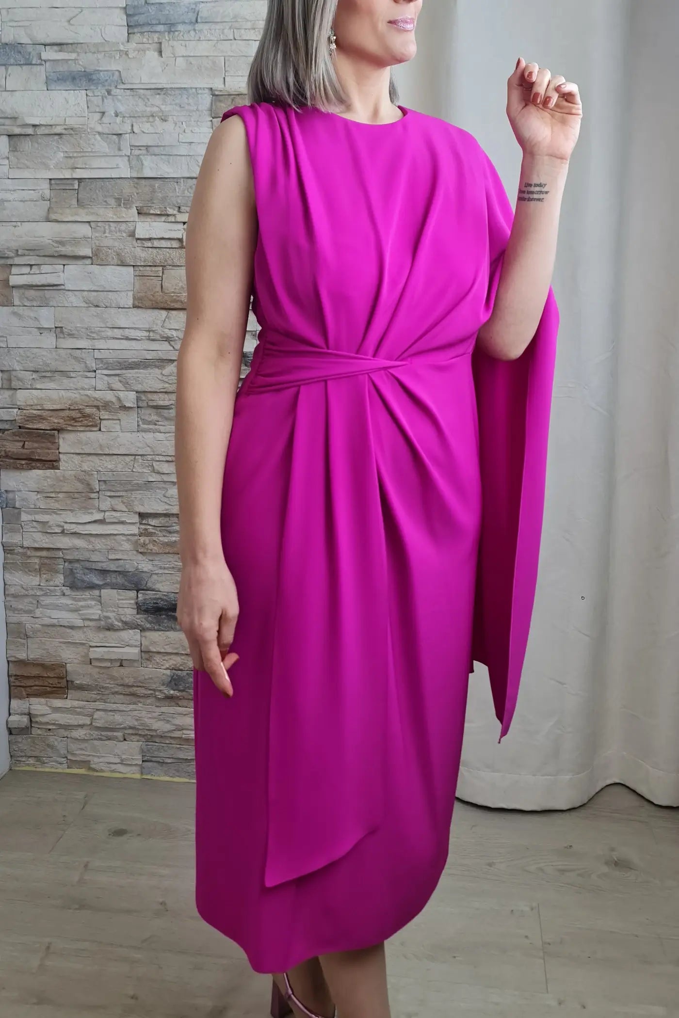 O vestido magenta exibido é uma peça de destaque, combinando elegância e modernidade. O design de um ombro só, com uma capa fluida que se estende pelo braço esquerdo, adiciona um toque dramático e sofisticado. O tecido estruturado e o comprimento midi criam uma silhueta elegante, enquanto a faixa na cintura define a forma.