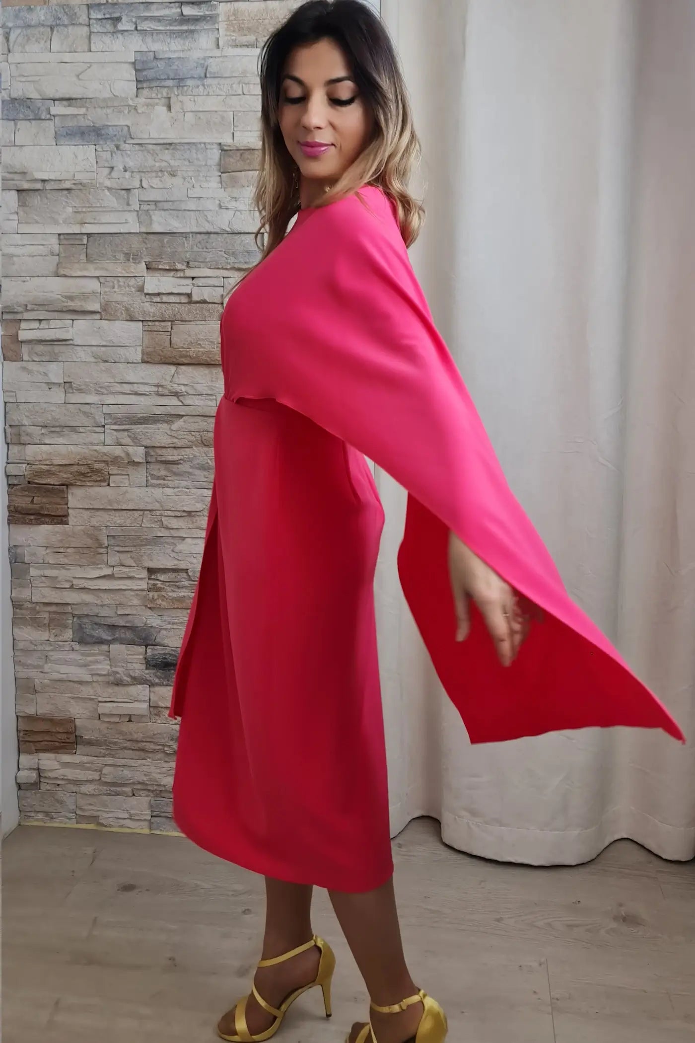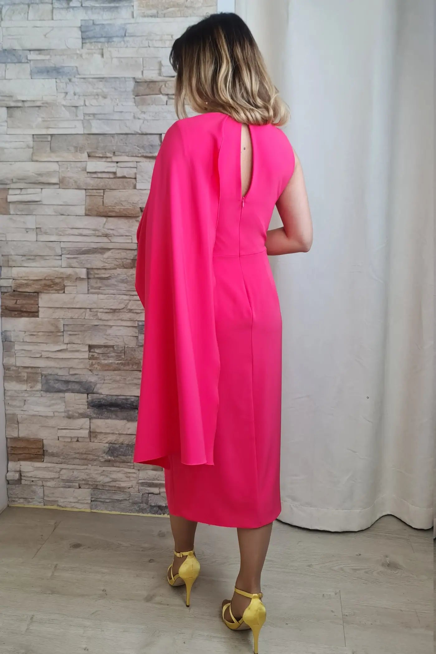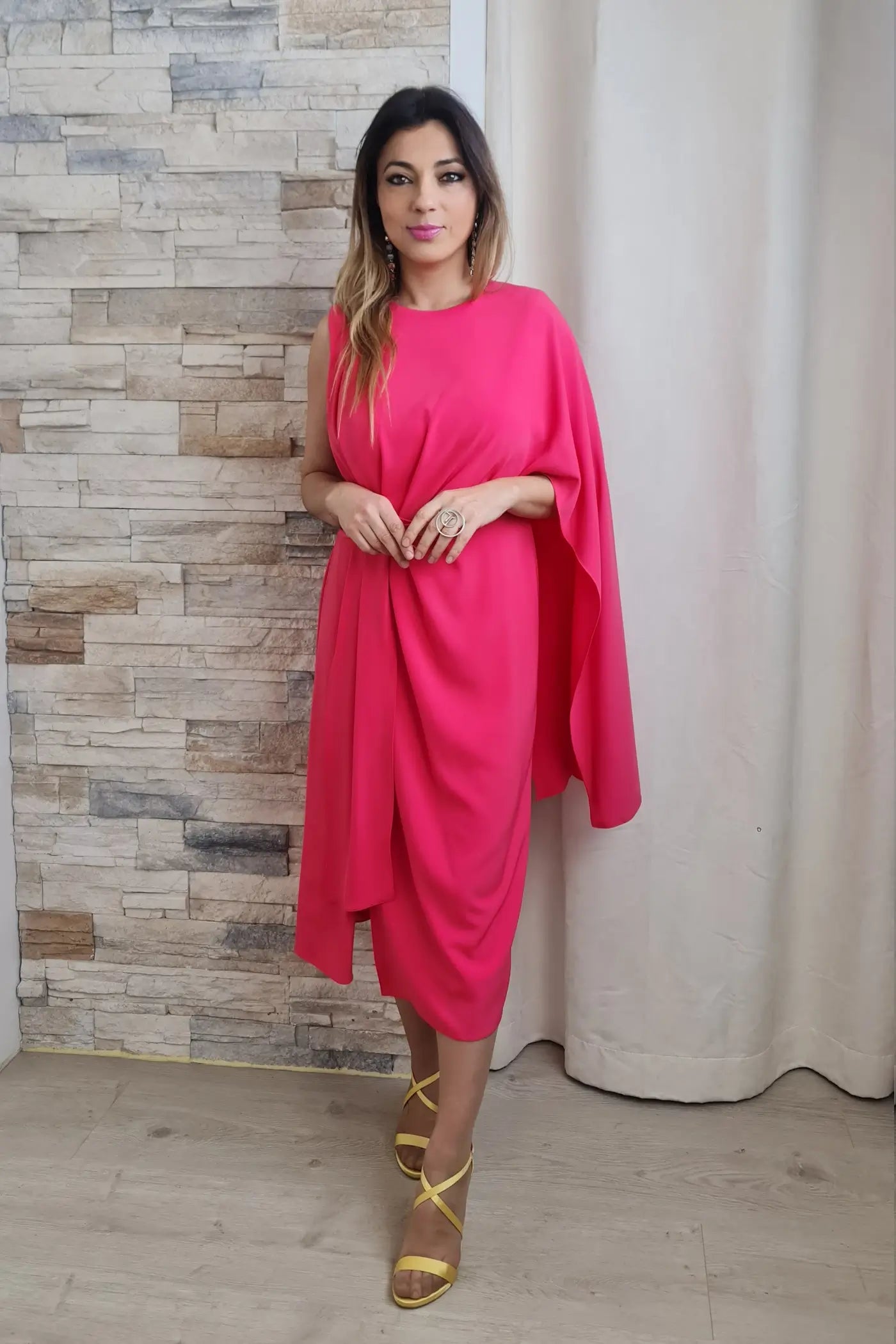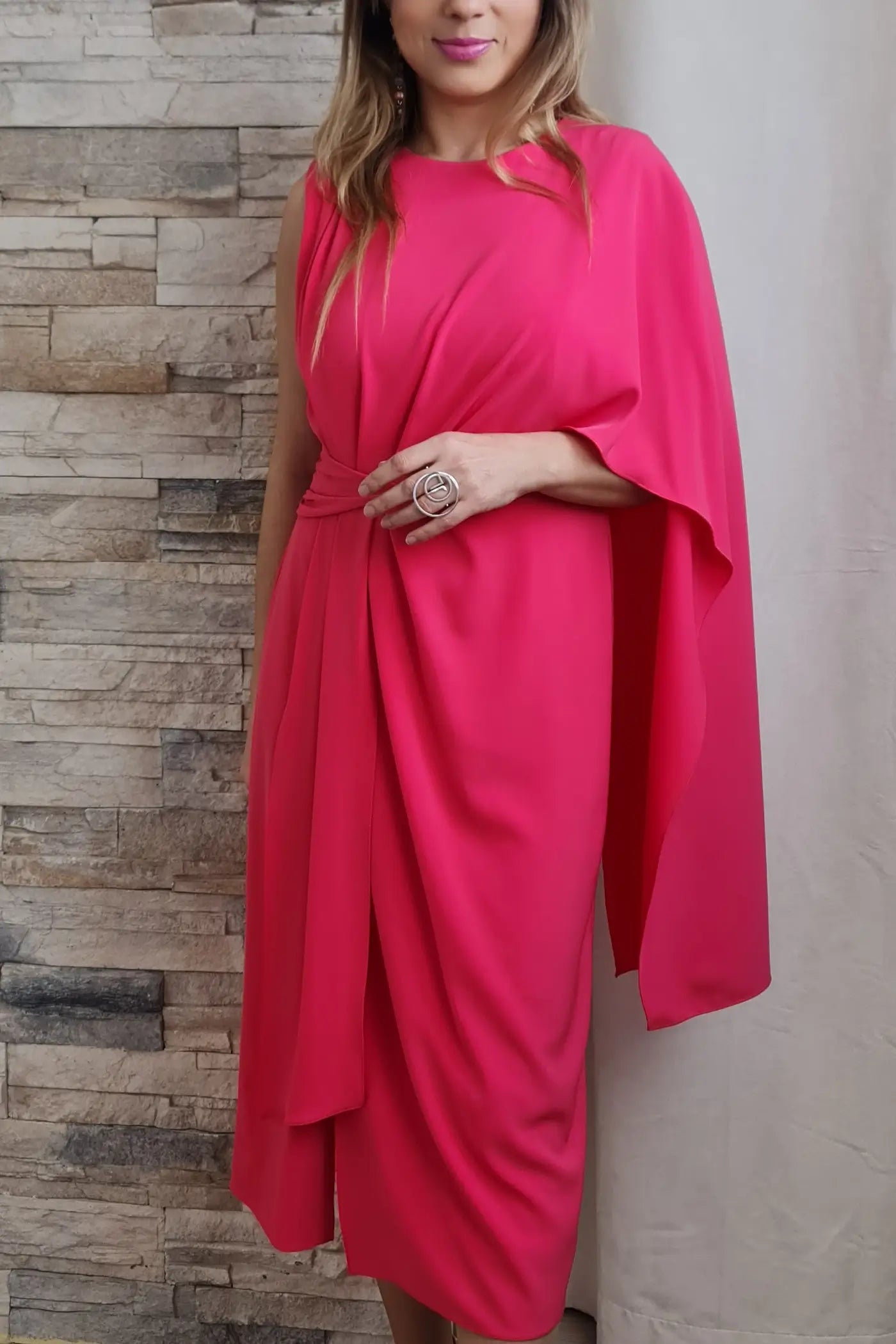 O vestido coral é uma peça que combina elegância e um toque moderno. O design assimétrico, com uma capa fluida que se estende sobre um dos braços, cria um efeito dramático e sofisticado. O tecido estruturado e o comprimento midi garantem uma silhueta elegante, enquanto o drapeado frontal adiciona um toque de interesse visual.