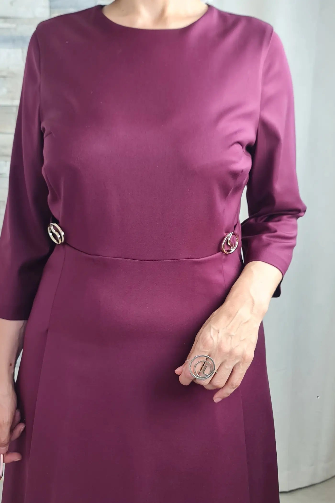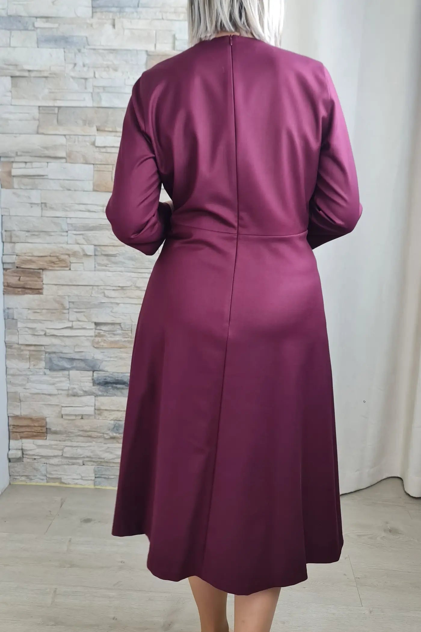 O design é clássico e versátil. Em tom bordeaux vibrante, destaca-se pelo decote redondo e pelas mangas 3/4, que conferem um ar elegante e discreto. O corte evasê da saia, que se alarga suavemente a partir da cintura, proporciona movimento e um toque feminino.