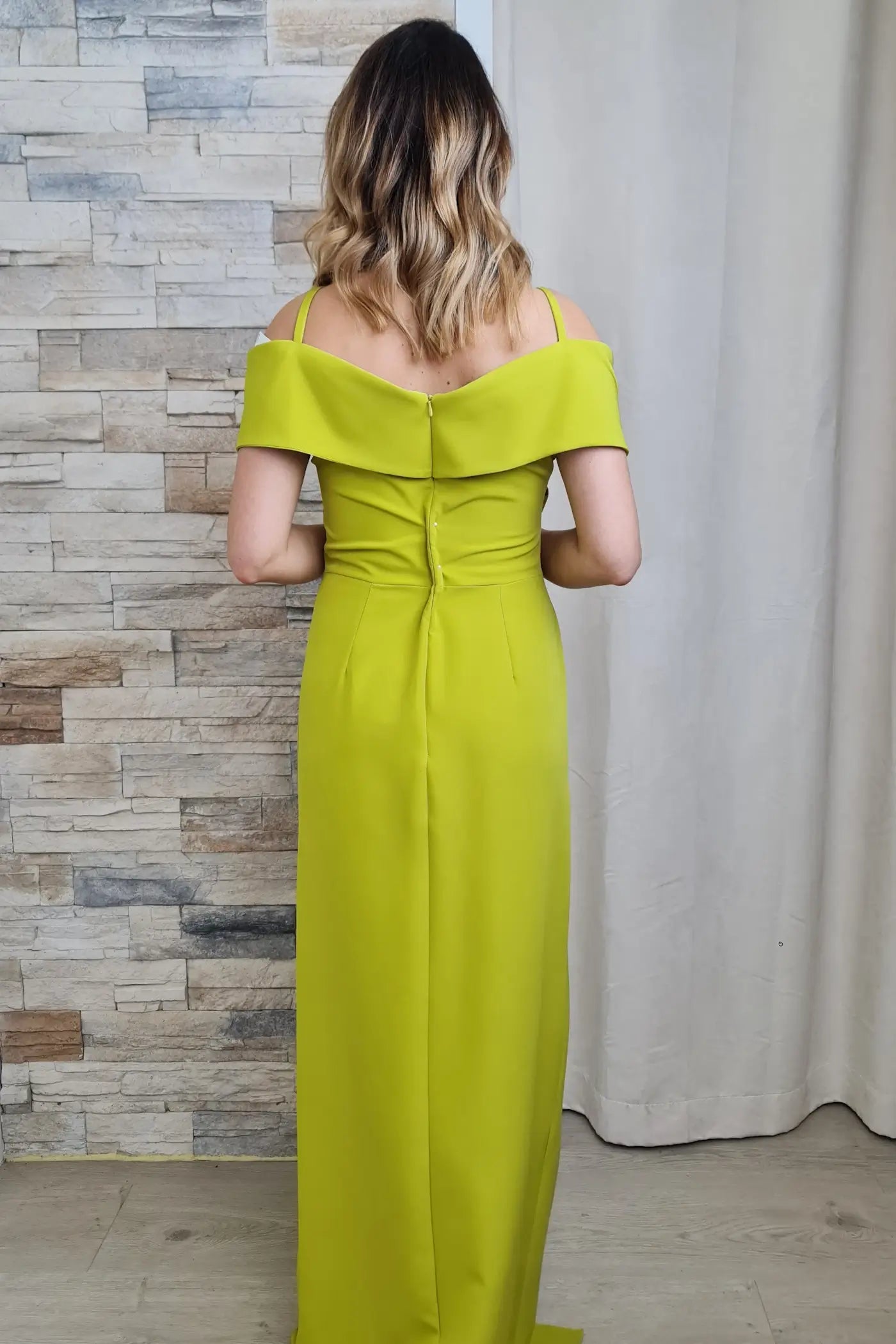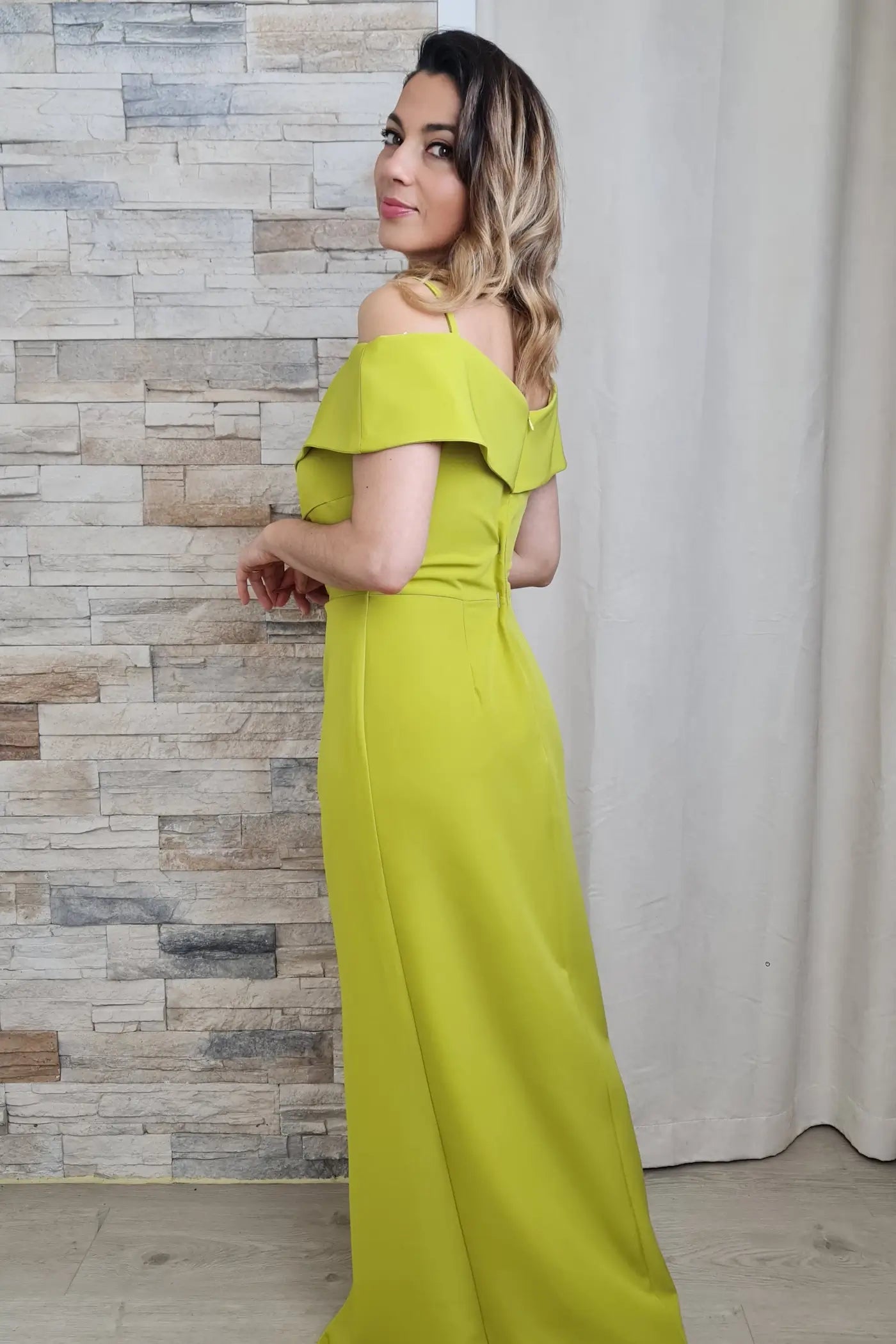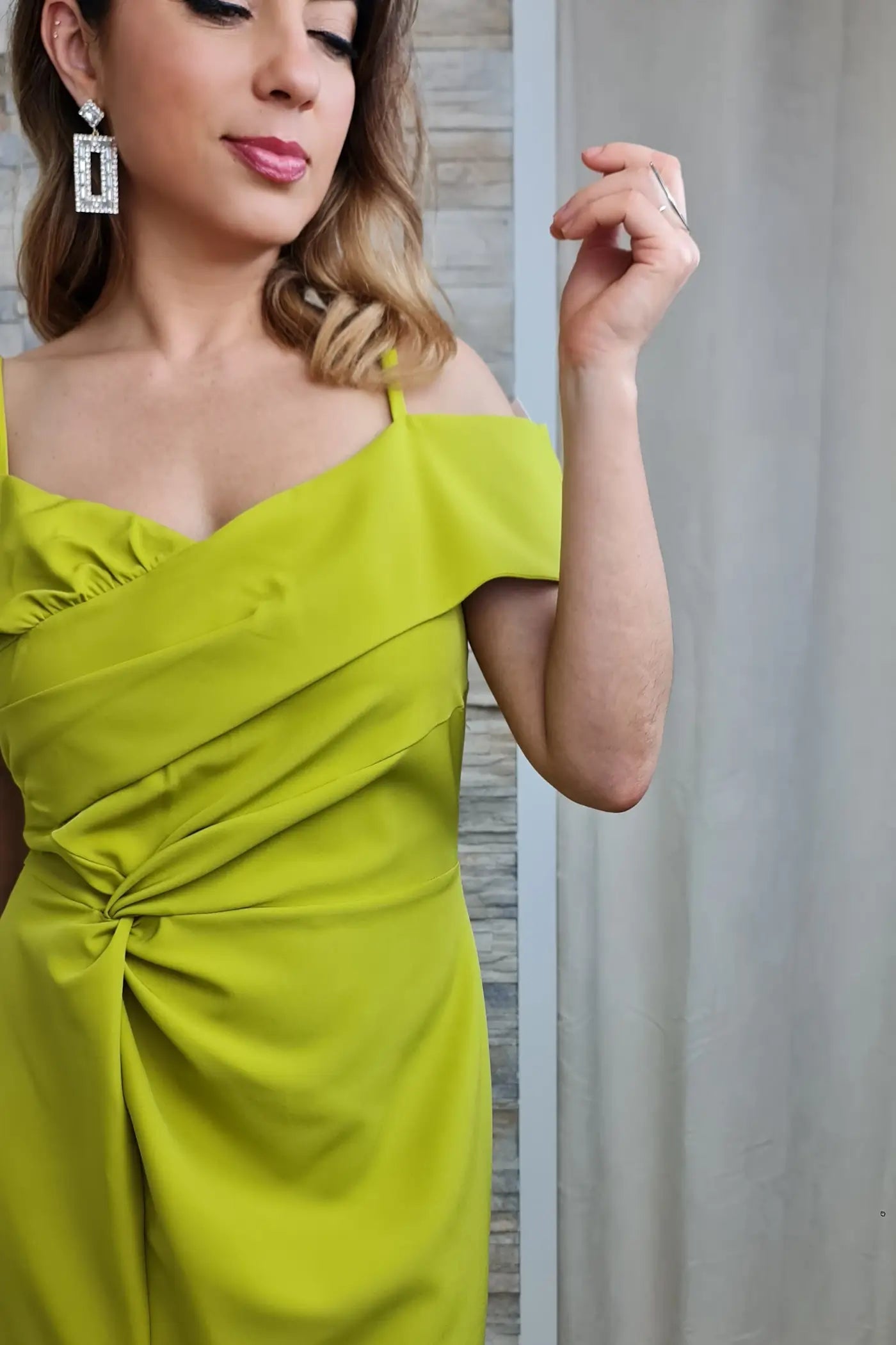 O vestido é uma peça moderna e elegante, ideal para eventos especiais. O design apresenta um corte longo com ombros de fora e mangas curtas. O tecido verde lima, com um leve brilho, confere um toque fresco e glamoroso ao look. Os detalhes do nó na parte da frente e a fenda lateral adicionam um toque de ousadia e sensualidade à peça. A silhueta ajustada define a figura feminina.
