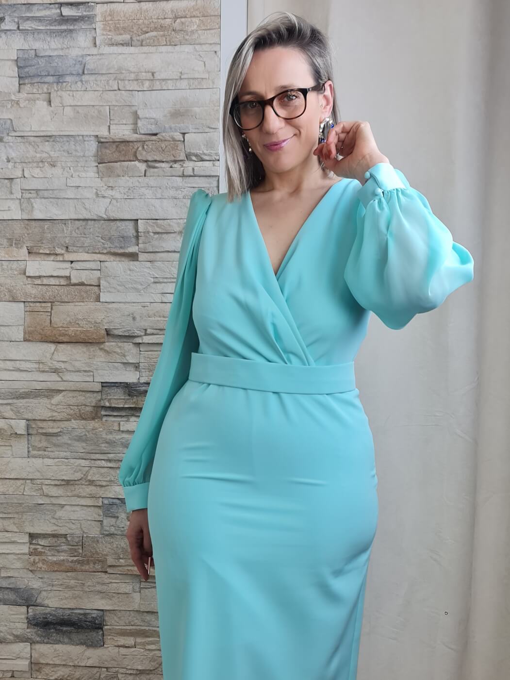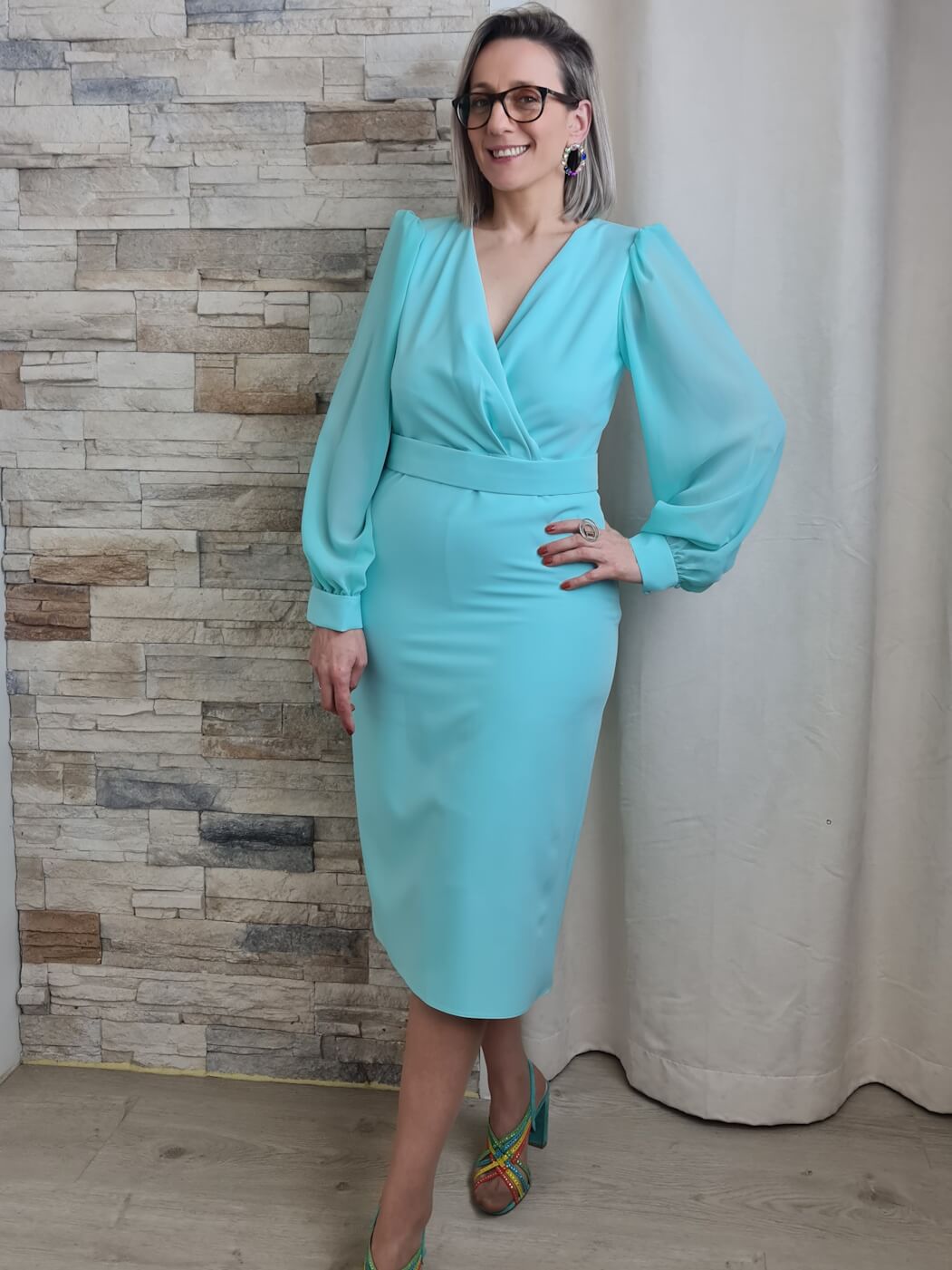 Este vestido midi em tom de verde água turquesa destaca-se pela sua elegância e sofisticação, ideal para eventos que exigem um toque de requinte. A silhueta ajustada define a cintura, enquanto o drapeado frontal cria um efeito visual interessante e favorecedor. O decote em V profundo alonga a figura e realça o colo de forma subtil, e as mangas compridas com volume nos ombros adicionam um toque de dramatismo e elegância.