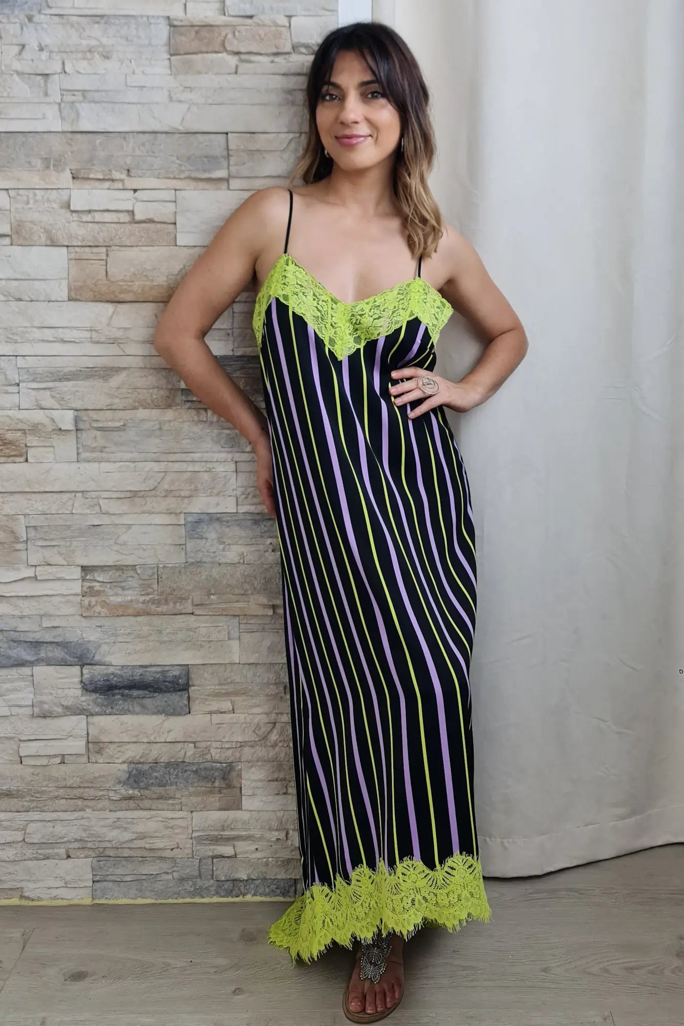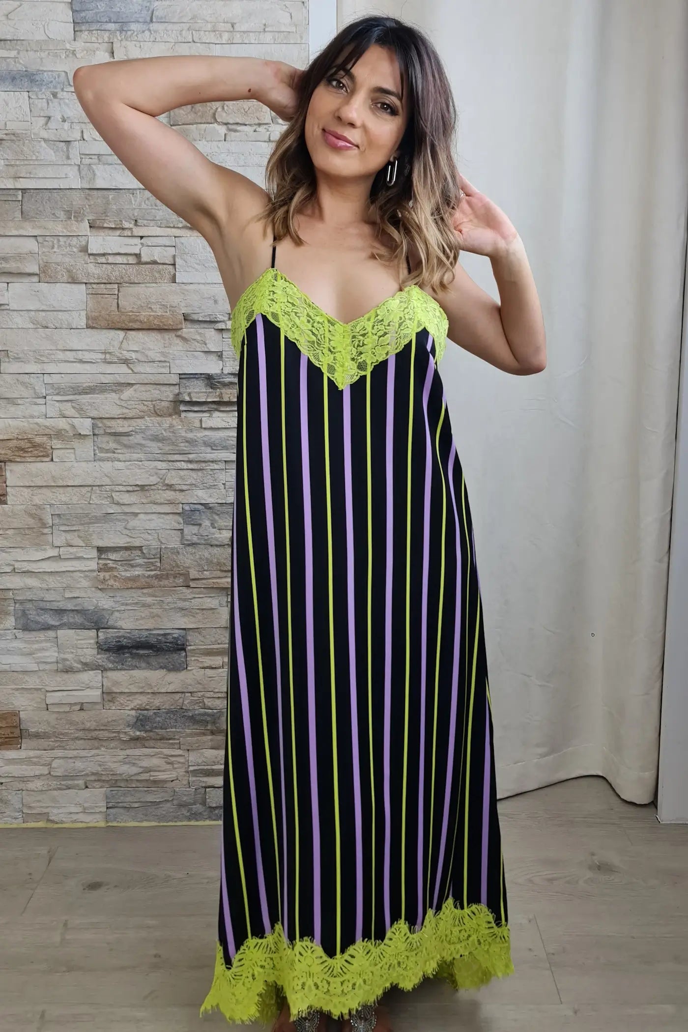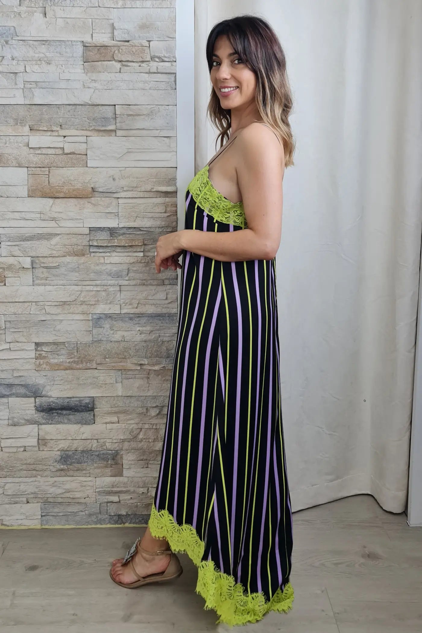 O design do "Vibrar com Alegria" é uma explosão de criatividade e estilo. Apresenta um corte longo e elegante com alças finas, que conferem delicadeza e sofisticação. O seu maior destaque são as ousadas riscas verticais em preto e verde-lima vibrante, que não só alongam a silhueta, como também infundem uma dose inegável de energia e modernidade. Os detalhes em renda exuberante no decote e na barra do vestido, também em verde-lima, adicionam um toque de feminilidade e um charme singular, tornando-o verdadeiramente único. Confeccionado em tecido leve e fluido, este vestido garante um caimento impecável e um conforto sem igual, perfeito para os dias mais quentes ou para adicionar um toque de frescura aos seus looks.