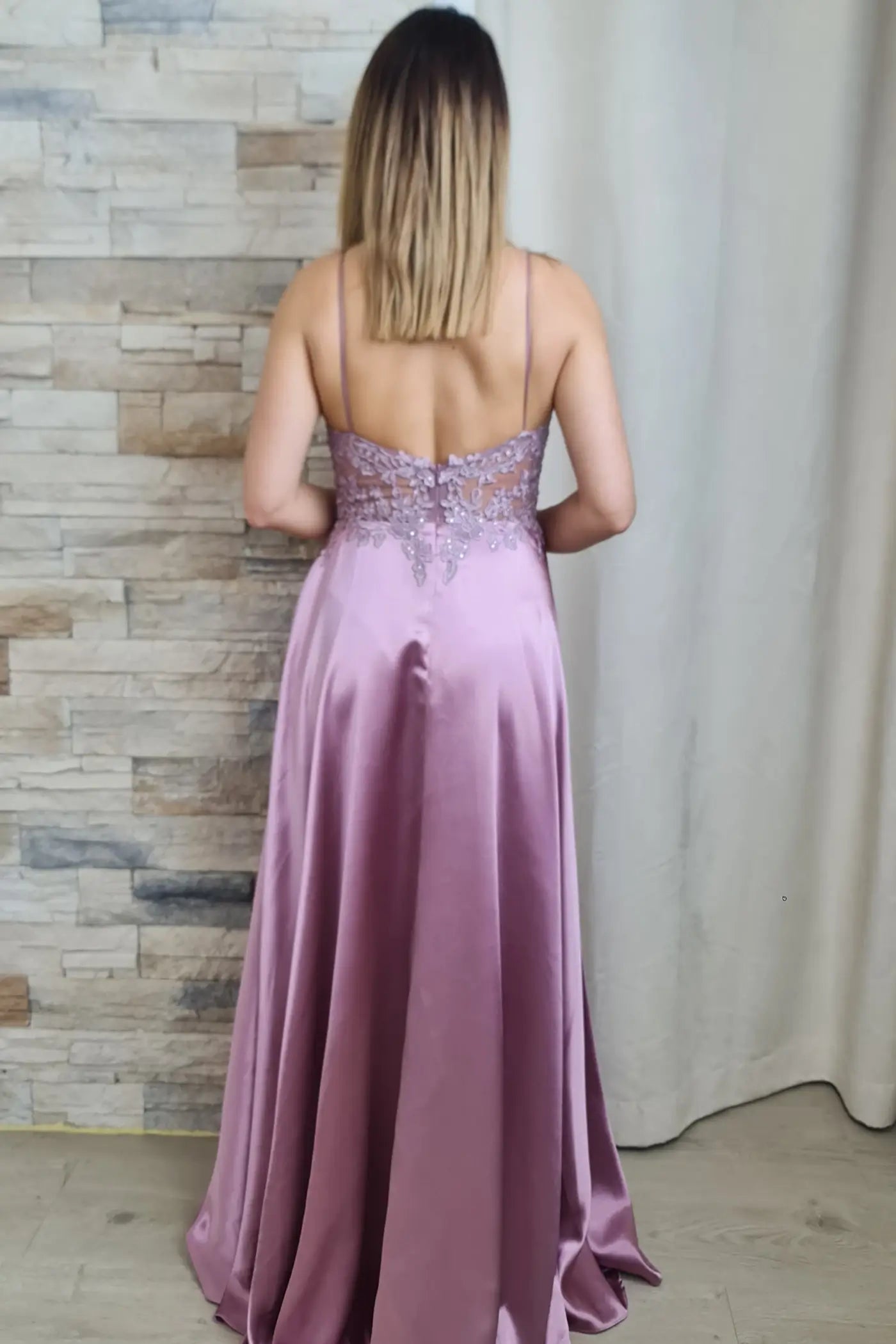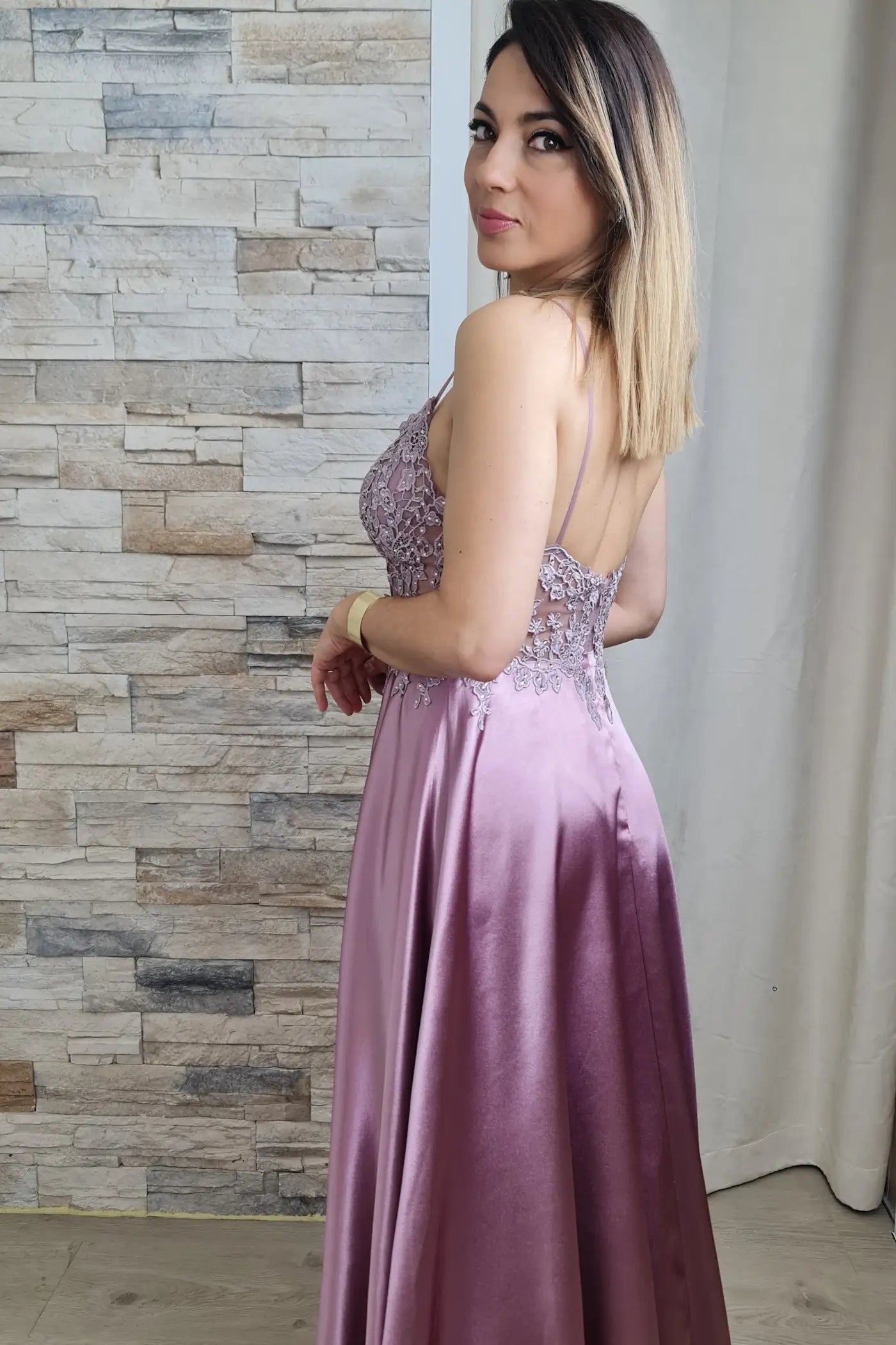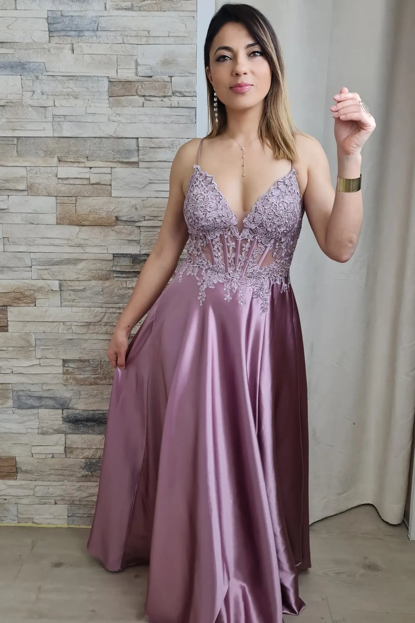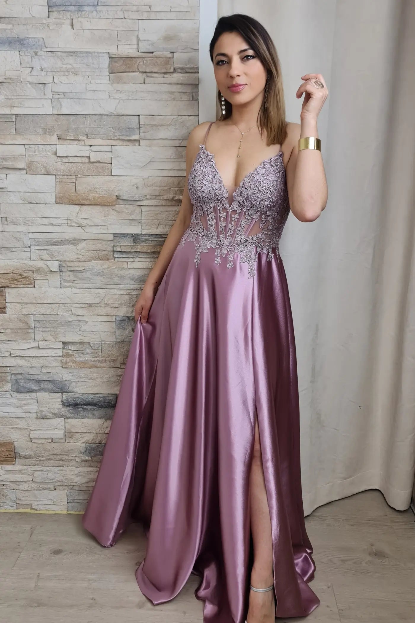 O vestido é longo e elegante, na cor rosa. Possui alças finas e um decote em V profundo com detalhes em renda floral que se estendem pelo corpete, criando um efeito visual delicado e sofisticado. O corpete é estruturado, com detalhes que lembram um espartilho, valorizando a silhueta. A saia é longa e fluida, com um bom caimento e um leve brilho acetinado.