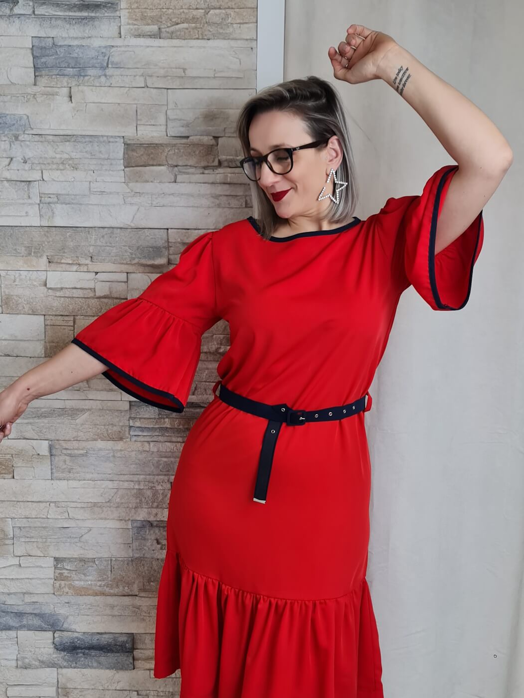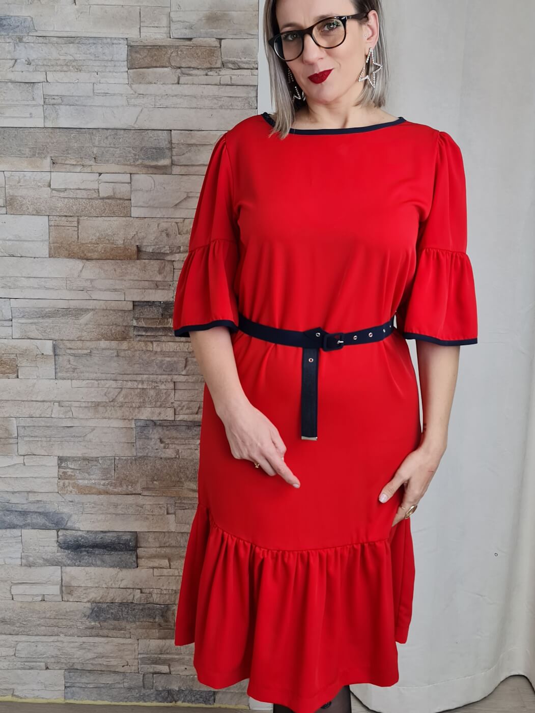 O vestido é uma peça moderna e elegante, ideal para diversas ocasiões. Apresenta um corte na altura do joelho com mangas a três quartos e decote redondo. A cor vermelha vibrante confere um toque alegre e sofisticado ao look.
