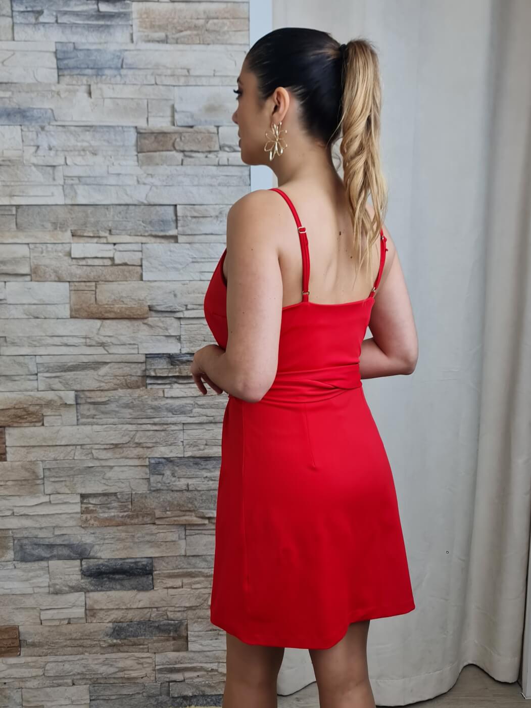 Um vestido vermelho vibrante e sensual que exala confiança. O vestido apresenta um design curto e ajustado, com um decote em V profundo que valoriza o colo. O tecido macio e fluído, proporcionando conforto e um caimento elegante.